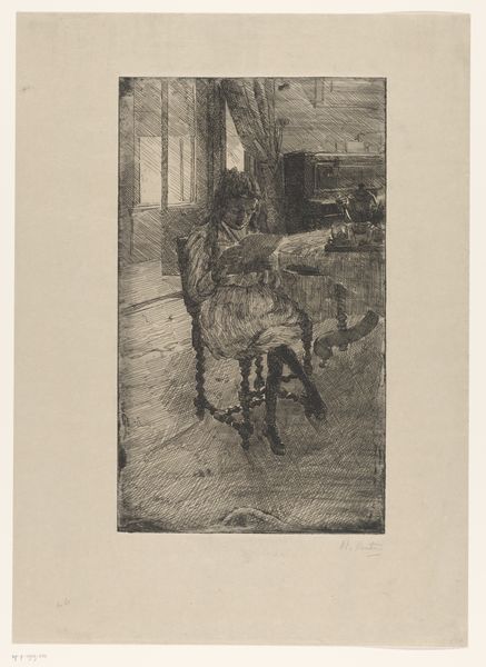 Curator: Let’s turn our attention to this print by Edgar Degas, made between 1879 and 1880. It's called "Mary Cassatt kijkt naar schilderijen in het Louvre"—"Mary Cassatt looking at paintings in the Louvre." Editor: Immediately, there’s a hushed intimacy about it, isn’t there? It feels like a stolen moment, a glimpse of private contemplation within a very public space. All in murky grays and blacks—evoking the solitude and introspection of observing art. Curator: Precisely. And note the clever composition. Degas gives us Cassatt’s back, her gaze directed towards unseen masterpieces within the Louvre. There’s a second figure almost hidden in the shadows next to Cassatt. Degas is showing us something about women's experiences in public spaces. Editor: Yes, she is almost concealed. What intrigues me most is what she might be thinking. Her whole posture seems… guarded, or is it just deeply thoughtful? Degas captures her as a viewer—not a spectacle, which must have been radical. The etching technique lends such incredible textural depth— the fabrics, the walls... It adds to this atmosphere of something secretly observed. Curator: Absolutely. Degas had a long engagement with printmaking. Look closely, and you see how the inky, almost blurred lines really suggest the grand scale of the Louvre, the echo of footsteps, and the weight of artistic history. Think too about Cassatt herself: a woman artist within that history, within those very halls! Editor: I find myself wondering about the unseen masterpieces. What are they looking at, and does their encounter shift something in how they think or feel, how they exist in their surroundings? How we exist? I also wonder if Cassatt liked how she was depicted— such an understated image, away from the gilded glamour and attention she probably navigated every day. Curator: That’s the genius, isn’t it? Degas gives us access to the hidden observer. We ponder art and our reactions to it, while also being reminded about access and experience. Editor: It does make one reflect, it’s not merely about seeing but truly about the encounter between ourselves and art. A very quiet and rather wonderful proposition.