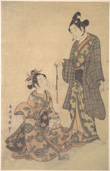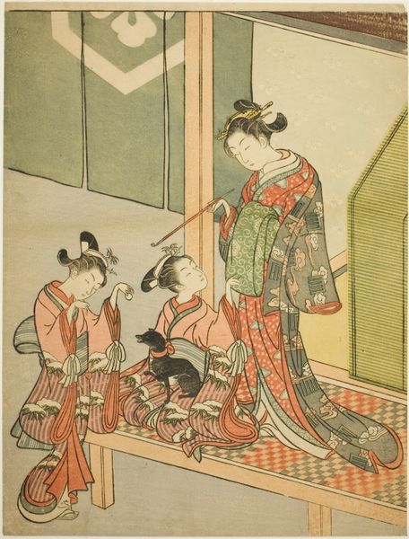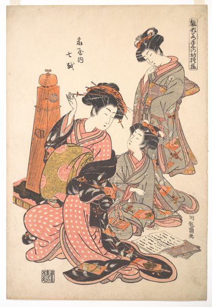 Torii Kiyonaga created this woodblock print, titled "Enjoying the Evening Cool at Nakasu," which now resides at the Metropolitan Museum of Art. This print offers us a glimpse into the leisure and beauty ideals of Edo-period Japan. Nakasu, a district in Edo (present-day Tokyo), was a vibrant hub of entertainment and social life. Here, Kiyonaga depicts three women, likely courtesans, enjoying a moment of relaxation. The print captures a sense of feminine grace and poise through the women’s elegant postures, elaborate hairstyles, and exquisitely patterned kimonos. The presence of musical instruments and fans suggests an atmosphere of refined pleasure and artistic expression. But, perhaps, it also reminds us of the restrictions placed on women in this society. Were they truly free, or were their lives confined to these carefully cultivated roles? Kiyonaga presents them as objects of beauty but also as figures with a quiet agency in their world. We are left to ponder what these images meant to those who made and viewed them.
