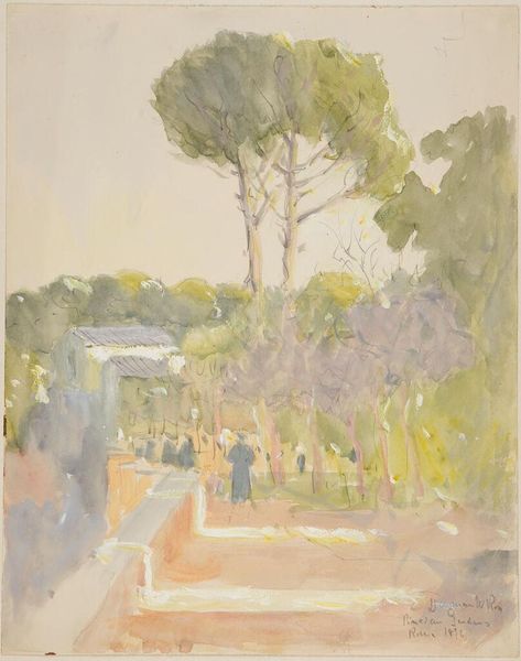 Editor: This is "Landscape with Three Trees, Near Naples, Italy" by Denman Waldo Ross, housed here at the Harvard Art Museums. The colors feel muted, like a memory fading into the fog. What do you see in this piece, beyond the obvious landscape? Curator: Oh, I adore how Ross captures a mood, a fleeting moment. Notice how the trees are almost like silent witnesses, standing guard over the landscape. It feels both familiar and dreamlike, doesn't it? Almost like a stage set. What do you make of that hazy light? Editor: It's true—the light gives it an ethereal quality. I hadn't thought of a stage set, but now I see it! Thanks for that perspective. Curator: It’s like a scene from a play, or a half remembered dream. Art is full of surprises, if you know where to look!