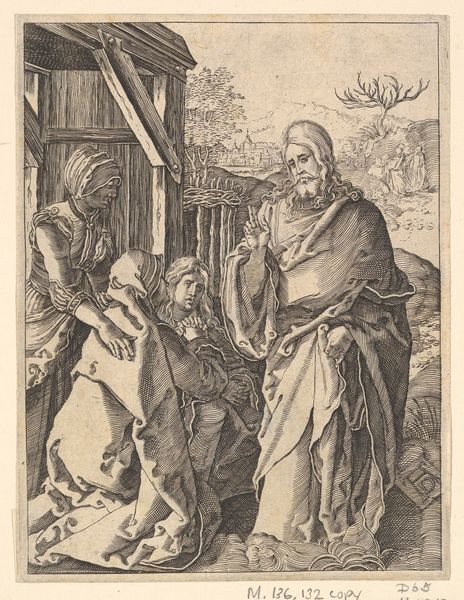 Lucas van Leyden created this woodcut, "The Bloody Coat of Joseph Brought to Jacob," in the early 16th century. During this period, the Netherlands was undergoing significant religious and social upheaval. The narrative depicts a biblical scene of deception and grief. Jacob is presented with the bloodied robe of his son Joseph, leading him to believe Joseph is dead. Van Leyden situates this story within a detailed Northern European landscape which perhaps underscores the personal and emotional weight of the scene. Jacob is depicted as an old, broken man, his body slumping. The messenger displays the coat, a symbol of lost innocence, stained with the brutal evidence of violence. This deeply human portrayal of anguish is set against a backdrop of everyday life. The print captures a complex blend of faith, family, and the harsh realities of human existence. It serves as a powerful reflection on themes of loss, deception, and the enduring strength required to confront life's most painful moments.