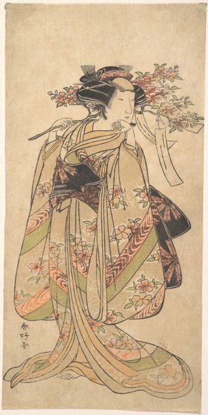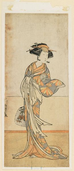 Okumura Toshinobu created this woodblock print of an actor, possibly Sanjo Kantaro, dressed as a courtesan in the early to mid-18th century. During this period in Japan, the roles of women in Kabuki theatre were performed by men, leading to a fascinating exploration of gender and performance. Here, the actor embodies the persona of a courtesan, navigating the complex intersections of gender, class, and identity in Edo society. Courtesans, while part of the pleasure industry, were also celebrated for their artistic talents and cultural knowledge, occupying a unique position in the social hierarchy. Toshinobu captures a sense of the ambiguous space inhabited by both the actor and the courtesan, each performing a role that challenges conventional norms. Notice the detailed kimono and umbrella, and the delicate features that evoke a certain emotional complexity. The print invites us to consider the fluidity of identity and the performative aspects of gender roles in historical and contemporary contexts.