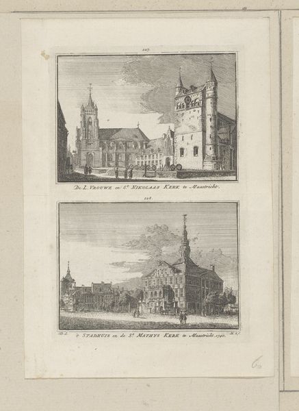 Editor: This print, "Twee gezichten op kasteel De Cannenburgh" by Hendrik Spilman, probably made between 1750 and 1792, depicts two views of the same castle. I'm struck by how different the perspectives are; one is quite grounded, the other almost seems to celebrate the castle's grandeur. What symbolic weight do you think Spilman gives to architecture in this piece? Curator: Architecture is indeed heavy with symbolism. Here, the two depictions function almost as memory and aspiration. The lower view, more formal and imposing, aligns with how the castle *wants* to be seen: a symbol of power and permanence. Do you notice how it's framed by water, creating a sense of separation and majesty? Editor: Yes, it definitely feels more staged, almost theatrical. And the top view? Curator: The upper view presents a more lived-in reality. The figures walking in the foreground humanize the scene, placing the castle within the everyday. The memory of the castle perhaps. It reminds us that buildings aren't just stone; they're stages for human activity, vessels of collective experience. Spilman seems to be acknowledging both the ideal and the reality, the symbol and the substance. How does this "double vision" affect your interpretation of the image? Editor: That’s insightful! It makes me consider the role of landscape in shaping identity and history. It's not just about architectural style, but about the relationship between people, place, and time. Thank you! Curator: A pleasure. Always look closely for the story woven into the image; it reflects not just the artist, but the culture from which it springs.