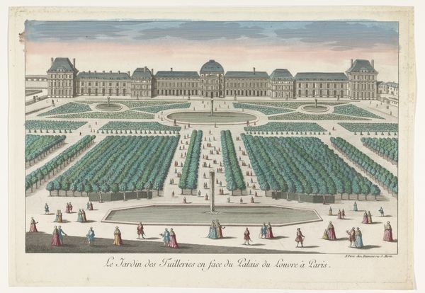 Editor: We’re looking at “View of the Tuileries Palace in Paris from the Tuileries Garden,” a print by Georg Balthasar Probst made sometime between 1742 and 1801, held at the Rijksmuseum. The layout of the gardens strikes me as meticulously planned, very ordered. How do you interpret this work? Curator: It’s a fascinating lens through which to examine power and social structures. These formal gardens weren’t just aesthetically pleasing; they were carefully constructed displays of control over nature and, by extension, society. What social groups do you think would have had access to these spaces? Editor: I imagine mostly wealthy people, nobles, maybe some merchants? It doesn't seem like a space designed for everyone. Curator: Precisely. And how does that limited access reflect the broader power dynamics of the time? These gardens, the Palace, everything speaks to the Rococo aesthetic. It’s an era where artistry and privilege intertwine. Editor: So the artwork serves as a record of who held power at that moment in time? Curator: Exactly. By visually representing this controlled environment, the artist subtly reinforces existing social hierarchies. But think, too, about the perspectives *not* included. Who built and maintained this space? Whose labor made it possible? Those stories are often erased from these idyllic depictions. Do you think an artwork like this can inspire a more nuanced conversation about social justice and historical power? Editor: Absolutely, especially if we look at it critically, asking those questions about labor and access. Thanks, I am seeing it in a new light. Curator: My pleasure! It's always about digging beneath the surface and challenging the dominant narrative.