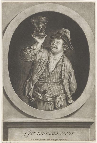 Curator: Looking at "Man with a Miniature Portrait in His Hand," dating roughly from 1615 to 1676 and attributed to Theodor Matham, the immediate impact is that of playful intimacy. It’s currently housed in the Rijksmuseum. What's your take on it? Editor: There's a strong sense of self-awareness emanating from the subject. The miniature portrait in his hand and even the smaller portrait attached to his feathered hat create almost an echo-effect; the man clearly has some story to tell about love or attachment that is visually quite compelling. Curator: Indeed. I think Matham offers a very public expression of personal feeling through these reproduced portraits. This was a period where access to likenesses of people became democratized through prints. Portraits start circulating. So how do these new technologies shift expressions of affection in Matham's era? Editor: Miniatures were significant status symbols and deeply personal tokens of affection. To publicly display these small likenesses meant something beyond the mere representation of wealth, something touching upon personal psychology and self-identity tied up within loved ones. I’m particularly intrigued by the portrait miniature attached to his hat feather—a seemingly frivolous addition that transforms the item from practical wear to ostentatious announcement. Curator: This form of display had political implications, of course, demonstrating who one favored in public society. The distribution of portrait prints allowed broader access to those in power, impacting perceptions of leadership. Beyond the personal, prints functioned to engage subjects with figures and ideas that influenced political debate. Editor: It highlights that people use images and their reproduction in complex ways to display devotion, personal taste, and even project power. In my view, it anticipates modern concepts of self-branding, demonstrating how images, especially portraits, act as extensions of one’s persona. This particular piece speaks to a timeless aspect of the human condition. Curator: Yes, the commodification of portraiture helped people align themselves to influential or political communities. I hadn't considered that modern self-branding implication, but that definitely opens another path for considering its continuing significance. Editor: And so we move from images of power to self-empowering images.