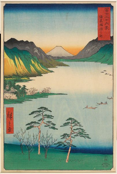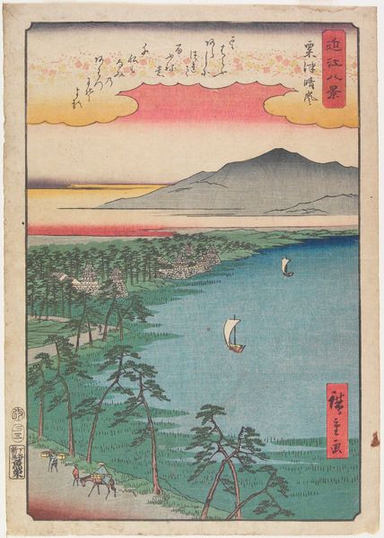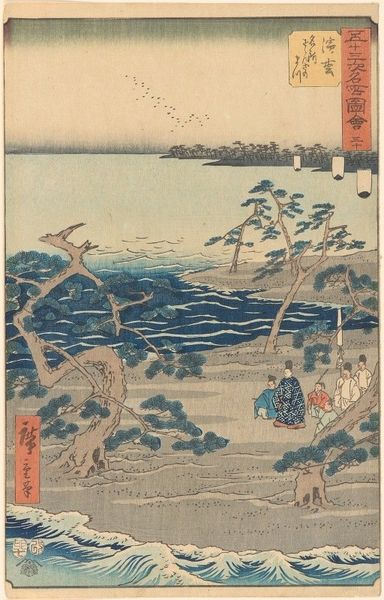 Curator: This serene woodblock print, "Oiso," created by Utagawa Hiroshige in 1855, invites contemplation. The composition draws the eye from the foreground up the hill to the coast and misty horizon. Editor: My first impression is how the repeating shapes and soft palette give it such a tranquil, almost melancholy air. It’s a visual poem of distance and longing. Curator: Utagawa Hiroshige, a master of the Ukiyo-e genre, used woodblock printing—a demanding process—to bring the scene to life, where each color requires a separate block. What’s fascinating is the material reality, the labor behind seemingly simple forms, transforming an ordinary scene into popular and reproducible art. Editor: Indeed. Let's consider the symbolism here: the line of stones may signify memorials to travelers or other ancestors. Then there's the contrast between the natural world and hints of human impact along the shoreline: perhaps the fleeting nature of life against a majestic scene. Curator: Utagawa's compositions of this type rely on visual patterns established for almost 200 years that were supported by skilled carvers and printers producing these works. The popularity of such scenes made it possible for them to use very costly Prussian Blue inks and still find a willing market. Editor: Even the choice of rendering distance evokes symbolic thought. Mount Fuji is faintly visible; what associations would it bring to those viewing? A national treasure; a connection to gods; strength in turbulent times? Curator: What strikes me about "Oiso" is Utagawa’s treatment of space; the textures, the craft to show this quiet beauty. One must really engage with it and ponder how labor elevates ordinary places to lasting images. Editor: I concur, these colors evoke powerful themes for me, touching on tradition and the emotional resonance held within cultural touchstones like the image of Fuji. It feels both ancient and timeless, speaking across centuries.