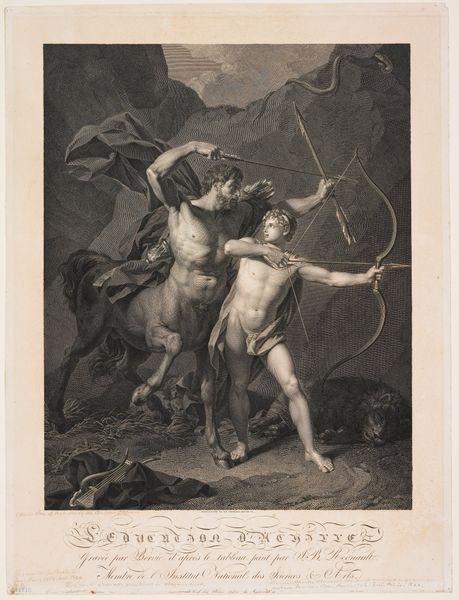 Editor: This is "The Training of Achilles" by Charles Clément Bervic. It’s quite striking! The figures of the centaur and Achilles are so dynamic. What do you see in this piece? Curator: It's a window into cultural memory. The scene depicts Chiron, the wise centaur, training Achilles. Note the discarded lyre. What does it suggest to you about the tension between artistic pursuits and martial training? Editor: It feels like a sacrifice of beauty for strength. It also feels very staged and posed. Curator: Exactly! The lion and snake become symbolic weights – tests of courage and cunning. Bervic is evoking a classical ideal: the formation of a hero through a specific iconography. A hero that must face difficult trials. Editor: I hadn't considered the staging before. That makes the piece so much more interesting! Curator: Indeed, it reveals how images reinforce our understanding of heroism itself.