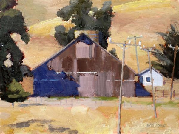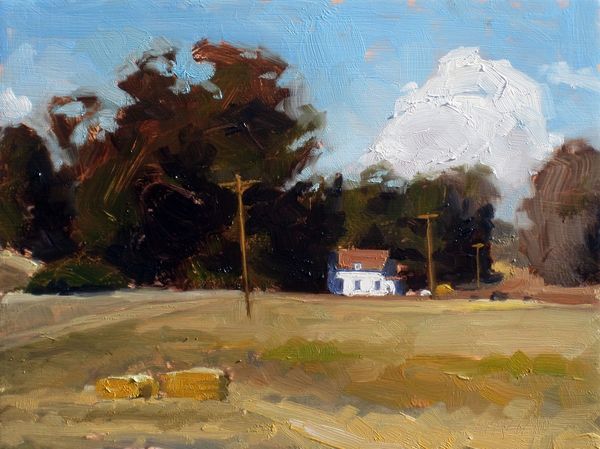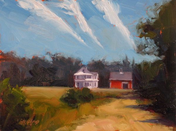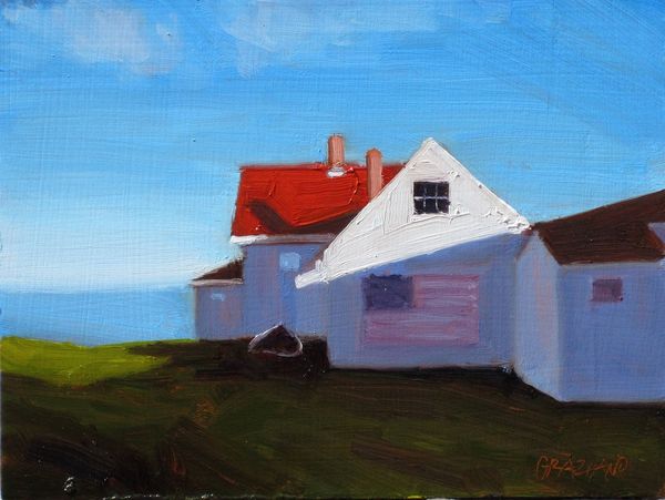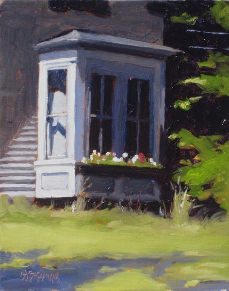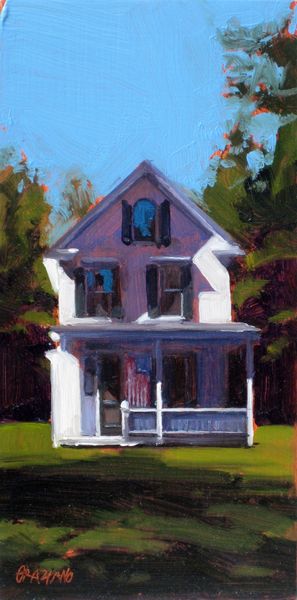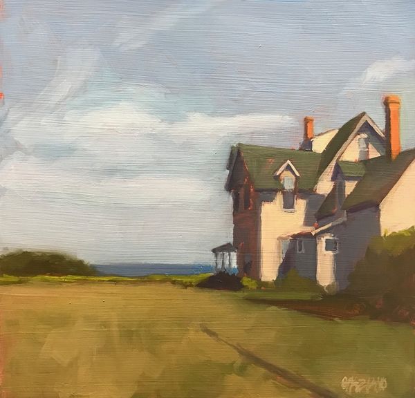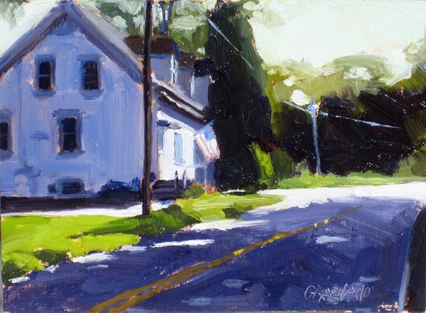 Dan Graziano painted ‘Shed’ with oil on panel, using thick brushstrokes and a muted palette that gives the scene an intimate and immediate feel. The shed is centered, its simple shape acting as a strong vertical anchor that divides the landscape into distinct zones. Notice how the composition uses the geometry of the shed—its triangular roof and rectangular body—to frame smaller windows. These shapes, along with the shed's shadowed areas, invite the viewer to consider depth and perspective. The surrounding foliage is rendered with looser strokes, contrasting with the sharper lines of the structure itself. In semiotic terms, the shed could be seen as a signifier of rural simplicity, while the way it is painted, with visible brushstrokes and a focus on light, transforms a mundane structure into an object of artistic attention. Graziano’s work encourages us to contemplate how everyday subjects can be elevated through artistic interpretation, blurring the lines between the ordinary and the aesthetic.