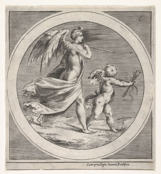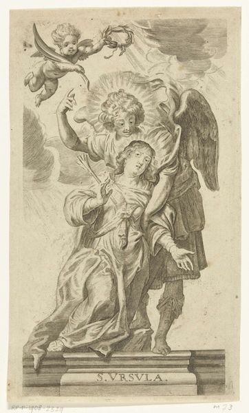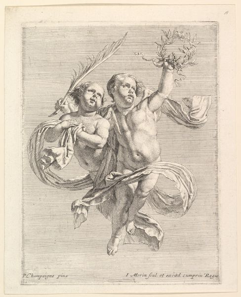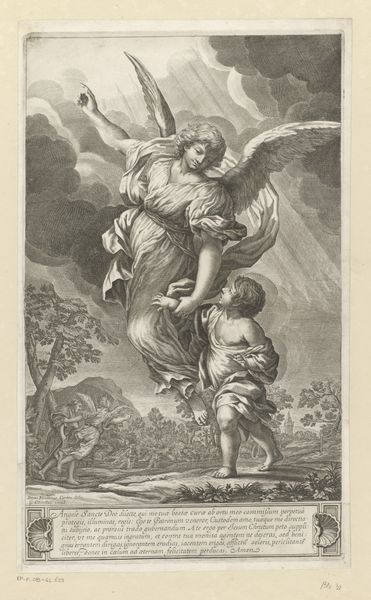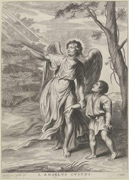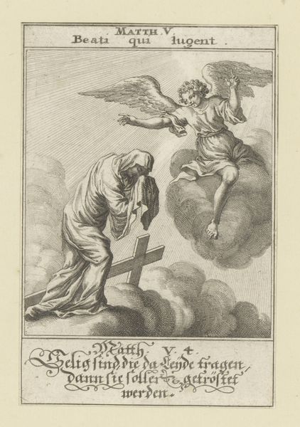 Claude Mellan created this delicate line engraving, "An Angel Indicates a Cross to a Man Kneeling," during the height of the Baroque period. Religious art of this time often served as a powerful tool in the Catholic Church's efforts to reaffirm its spiritual authority, particularly after the Protestant Reformation. Here, Mellan presents a moment of divine intervention: an angel, rendered with a soft, almost human touch, guides a kneeling man towards the cross. It’s impossible to ignore the emotional weight, as the man’s posture conveys humility and reverence. Mellan masterfully uses light to draw our eyes to the cross, the ultimate symbol of salvation. Rather than adhering strictly to traditional depictions, Mellan infuses his figures with a sense of grace and humanity. This engraving invites us to reflect on our own beliefs. It captures a deeply personal moment of faith, connecting the divine with the everyday struggles of human existence.