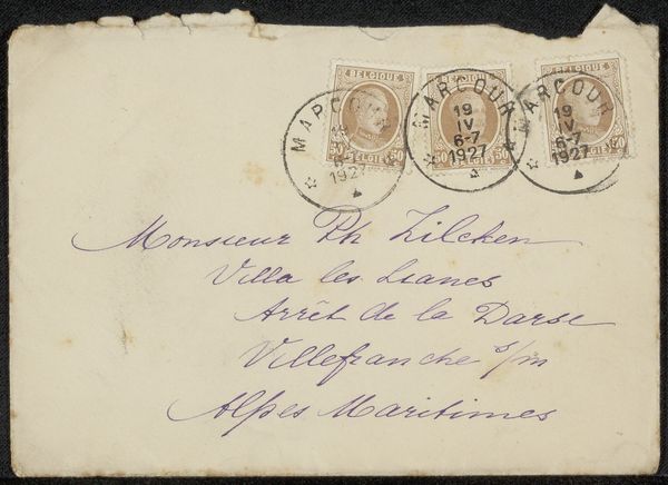 This calling card envelope is an understated artwork, whose creation date and artist have not been recorded. The writing in dark ink against the pale paper creates a stark contrast, immediately drawing the eye to the script. The script itself follows a vertical arrangement offset by a circular stamp. What might be construed as a casual piece of correspondence is a carefully arranged tableau. Each stroke of ink, each curve and line, contributes to a balanced asymmetrical composition. The text’s legibility is secondary to its visual impact; it functions almost as abstract marks. Consider the semiotics at play: the script and stamp are signs, denoting status and authority. Yet, they also function aesthetically, with the ink acting as a deliberate mark-making. It reminds us that even the most functional items can be elevated to art through intentional design and visual language.