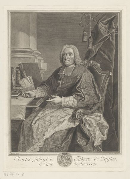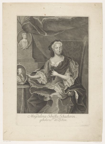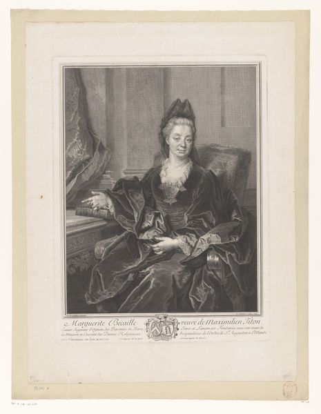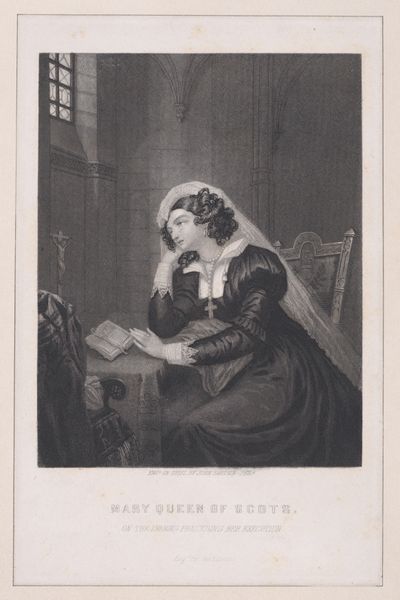 Curator: Oh, this engraving hits you right in the gut, doesn’t it? Like a melancholic sigh given visual form. Editor: Indeed. This is “Mary, Queen of Scots Under Confinement,” an engraving made by James Ward in 1793. It captures Mary in a moment of reflection during her long years of imprisonment. Curator: The greyscale does so much here; it's like seeing her world drained of color, reflecting her spirit maybe. And that crucifix hanging outside the window, almost mocking in its inaccessibility…powerful. Editor: It’s worth noting how Ward has depicted Mary within a well-established iconography of female suffering. Think of contemporary stage plays; the visual language emphasizes her isolation, but also hints at her noble bearing, keeping the sympathy of the audience. Curator: The rumpled sleeve. It’s small, I know, but that simple detail gets me every time. Even Queens feel the tedium and frustration, eh? Trapped but also beautiful, holding herself together but showing the stress. A brilliant visual tension! Editor: And this print form itself is key to its dissemination. Remember, prints allowed imagery, and therefore, narratives, to circulate widely. Here, Ward isn't just creating art; he's contributing to a potent and prevailing narrative about monarchy, religion, and political martyrdom. Curator: Almost a propaganda piece, you’re saying, cloaked in elegance and grief? Hmm... I see your point! Suddenly it feels less about personal reflection and more about…the manipulation of history. Tricky, those visual stories, aren't they? Editor: Exactly. This is more than a portrait of a woman in a room; it’s a calculated contribution to how Mary, Queen of Scots is remembered and understood in a specific socio-political environment. Curator: So, as with all powerful pieces, its enduring charm lies in that dichotomy: sorrowful captive queen versus calculated historical player. What a whirlwind for one piece of paper. Editor: Yes, and the success and continuing relevance of that tension, for me, solidifies Ward's art's vital contribution.
