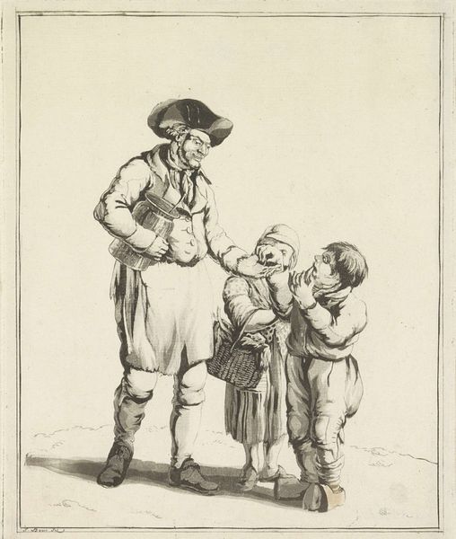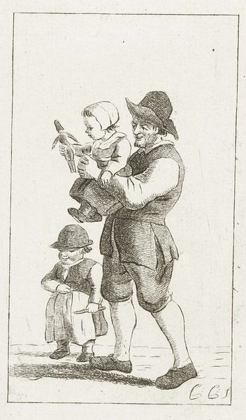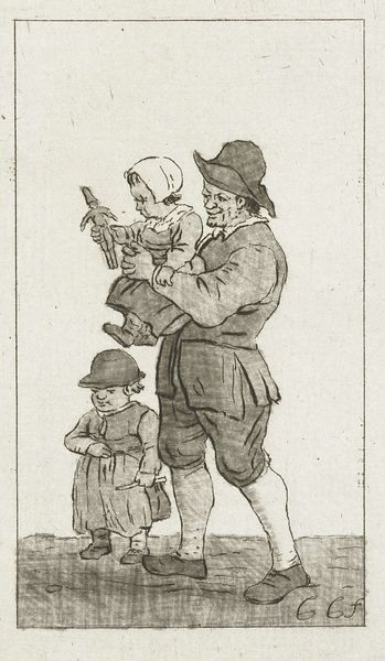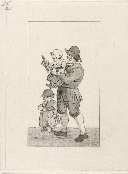 This drawing, “Father with Children,” was created by Pieter de Mare, using pen and brown ink, sometime in the late 18th century. Here, we see a father carrying one child while another walks beside him. Note the doll clutched by the child in his arms, a primal object of comfort, a simulacrum of life itself. This seemingly simple toy is laden with cultural weight. Dolls appear as votive offerings in ancient graves and as representations of fertility goddesses. Across millennia and cultures, the doll persists as a symbolic bridge between reality and the imagined, the animate and inanimate. The father's tender gesture, reminiscent of ancient depictions of familial love, elicits a powerful emotional response, tapping into our collective memory of familial bonds. Observe how such imagery transcends time, echoing in Renaissance paintings of the Madonna and Child, where maternal love is celebrated as a divine virtue. Such non-linear progression highlights how cultural symbols evolve, resurface, and gain new layers of meaning throughout history.