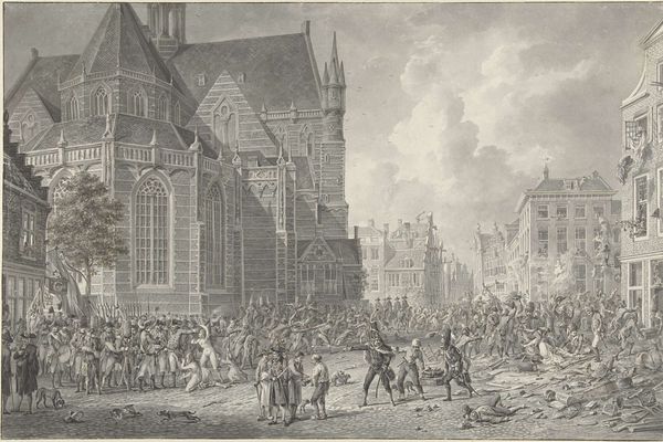 Curator: Richard Parkes Bonington, a master of Romantic landscapes, crafted this lithograph, "Church of the Abbey at Tounus," in 1825. The piece presents us with a bustling cityscape, centered around the grand abbey. Editor: It strikes me immediately as a kind of hushed chaos. All these figures swirling around the stoic, almost blurry architecture—it feels like memory itself, or maybe a fleeting dream of a marketplace. Curator: Exactly, the way Bonington uses soft, almost ethereal lines lends the scene a dreamlike quality. The eye is drawn to the complex interplay of light and shadow, note the stark contrast highlighting the architectural details of the abbey, and see how it commands your attention amid the crowds. It seems he was experimenting here with architectural romanticism, especially noting that it's a lithograph print. Editor: Yes, I think he is. You can sense the sublime looming even here. It's the contrast, though, that really intrigues me. Look how small these figures become in juxtaposition with the building's enormity. Are they celebrating, do you think? Are they trading wares? There's this incredible feeling of ephemerality, which you are correct about. Curator: The piece blends genres, with romantic undertones enriching the cityscape. He had this remarkable ability to find a unique harmony, balancing those architectural structures and all the fleeting details of life and city bustle. The choice of monochrome, with its limited shades, enhances its appeal, I feel. Editor: Monochrome pulls focus, sure. More than that, I think that limitation—or that constraint if we look at the image in a very formal way—adds to its lasting resonance, somehow. Everything seems faded and precious because the tones are soft. Curator: Precisely, almost like capturing a whisper of a moment. The atmospheric depth, the textural variations achieved with the lithographic process are what draw me into Bonington's piece. A testament to Romantic art. Editor: I concur! The image leaves me wondering about our transient human lives within an image. Thank you for all of this—insight and the sharing of such fascinating artistry!