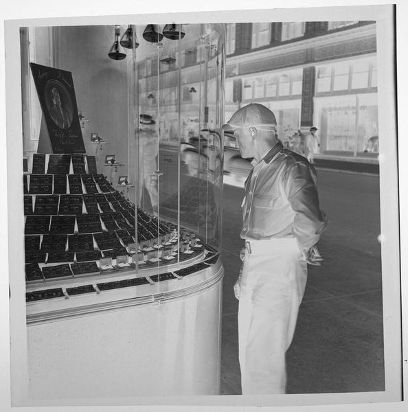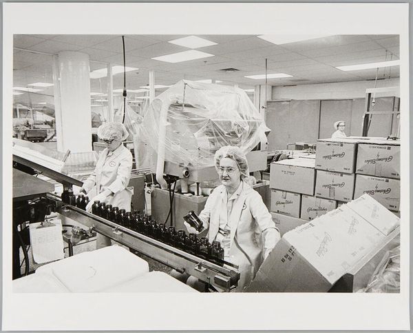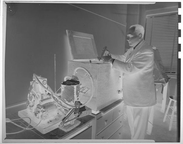 Editor: Jack Gould’s "Untitled (scientist adjusting lage rods inside reactor)" really strikes me as a moment frozen in time. What cultural significance do you see in this image, especially given the subject matter? Curator: This work resonates with the anxieties and hopes of the atomic age. The scientist, almost Christ-like, manipulates the rods—symbols of immense power, both creative and destructive. Do you see the stark contrast in the image? Editor: Yes, the intense highlights and shadows definitely amplify that duality. It’s like a visual representation of the fears and promises associated with nuclear energy. Curator: Exactly! It reflects our collective memory of a time when science seemed to hold the keys to both utopia and oblivion. The rods become more than just objects; they are icons. Editor: It's fascinating how a seemingly straightforward image can hold such complex cultural weight. I'll definitely be thinking about this one for a while. Curator: Indeed. Images often operate as powerful carriers of shared experience.