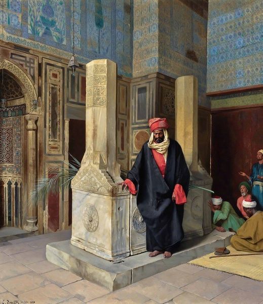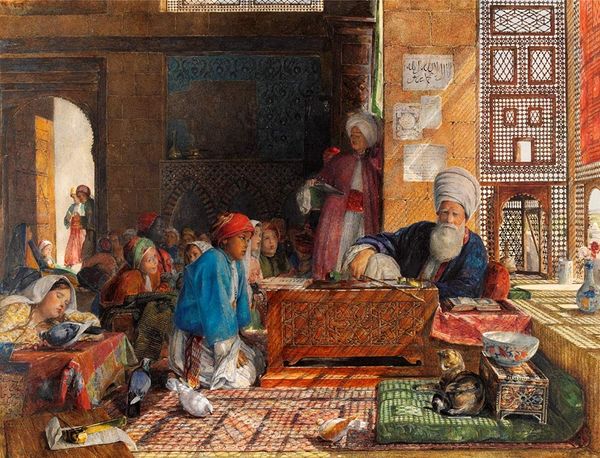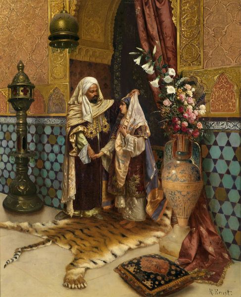 Curator: Before us is "The Favourite," a figurative painting believed to be by Rudolf Ernst, although its precise date remains unknown. Editor: My first impression? It feels staged, almost like a theatrical tableau. There's an opulence in the details, but also a distance, a sense of observation rather than intimacy. Curator: The painting technique uses oil, watercolor and gouache. You see orientalist elements here in the costumes, architecture, and subject matter, invoking 19th-century European fantasies about the "Orient." Editor: Exactly. It’s important to recognize how these fantasies served a political purpose. What does it mean to depict women in such a posed manner, particularly within a colonial context? The standing figure is clearly of higher status than the kneeling woman holding the musical instrument. We see that difference represented formally in the work, the figure standing over the other kneeling below them. It gives an impression that it reinforces stereotypes of hierarchy and power dynamics. Curator: The light, color palettes, and details carry cultural significance. Note the flowers that could imply themes such as beauty, status, and impermanence; and the ornate jug suggesting something rare. These images would have been familiar to contemporary viewers of the artwork, thus creating a clear reference that they understood. It also draws visual parallels to early Renaissance altarpieces of kneeling supplicants at the feet of divine rulers. Editor: While appreciating the surface aesthetics and symbolism, we can consider the painting through the lenses of Orientalism and feminism. What assumptions does it make about the depicted women, their roles, their desires? Whose gaze is being privileged? We should explore beyond surface beauty to reveal those important intersections between representation, identity, and power. Curator: And what do you think this artist meant to communicate with such carefully arranged components? To invoke exotic beauty, luxury, reverence perhaps, or the simple indulgence in cultural stereotypes. Editor: Well, seeing it through that lens reveals not only artistic style but the insidious power of cultural narratives that continues to shape our world. I believe that critical assessment adds nuance. Curator: Indeed, every artwork has layers of meanings waiting to be uncovered.