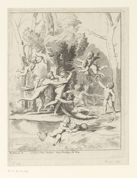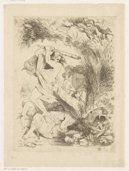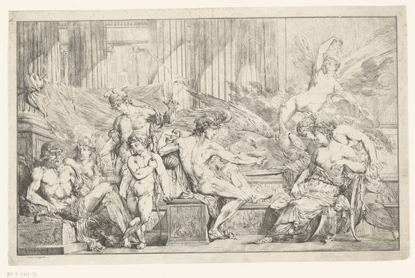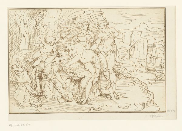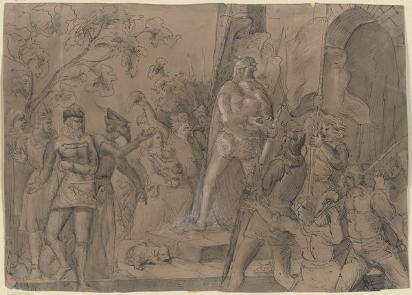 Editor: This drawing, "Martyrdom of Saints Processus and Martinian," by Jean Bernard Restout, is rendered in pencil, charcoal, and chalk on paper. The composition, with its flurry of figures, feels quite dynamic, even unfinished. What strikes you most about it? Curator: I find myself drawn to the artist’s articulation of depth using purely linear means. Observe the strategic deployment of hatching and cross-hatching to generate not only tonal variations, but also to suggest volume and spatial recession. Notice, too, the juxtaposition of tightly rendered figures in the foreground with the more loosely sketched figures in the background. What does that communicate to you? Editor: It seems to push the main action forward while implying a vastness of onlookers. It almost feels like the foreground action is more important to look at than anything happening in the background. Is the foreshortening of the figures contributing to this as well? Curator: Precisely. The exaggerated foreshortening, especially in the figure being prepared for execution, forces the viewer’s eye into the pictorial space, heightening the drama. Also note Restout’s confident use of contour lines; they are not merely outlines but active agents in defining form and suggesting movement. How would you say that affects the piece overall? Editor: That gives the figures energy! This has helped me look beyond the narrative and appreciate the techniques used. Thanks for illuminating Restout’s strategies! Curator: My pleasure. Focusing on technique often unlocks greater appreciation of form and content.