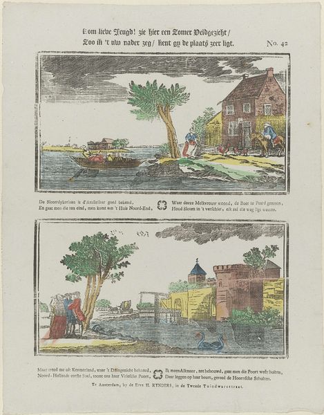 Curator: Look at this engraving. Made by Erve H. Rynders sometime between 1831 and 1854, it's titled "Kom lieve jeugd! zie hier een zomer veldgezicht / Zoo ik 't uw nader zeg / kent gy de plaats zeer ligt", now residing here at the Rijksmuseum. What strikes you first about it? Editor: It's quite charming, almost like a storybook illustration with its distinct sections. The upper landscape scene feels peaceful, with figures dotting the rural scenery, but something in the sharp angles and slightly chaotic linework hints at underlying social tensions, don't you think? Curator: I'd say your feelings are valid; consider that this piece belongs to a larger history of printed landscapes circulated among the Dutch bourgeoisie. Printmaking enabled broader distribution of imagery, and allowed artists to circulate not only idyllic countryside views but also commentaries on urbanization and the changing role of labor and class. The scenes chosen reflect pride in local identity and landmarks. Editor: Ah, I see that historical and geographical encoding working. But the placement of the text also affects how I see it. Look at how the textual elements, particularly that initial phrase imploring "dear youth," almost functions as an open call—positioning viewers as active participants invited to decipher familiar localities. I wonder, was this primarily a didactic tool for children, meant to instill certain cultural values, or was it broader in scope? Curator: The combination of imagery and text definitely suggests a didactic function, and helps anchor the visual in a local context, so I would guess the viewer was at least Dutch, or someone familiar with the locations presented in the artwork. As for the cultural values you mentioned, I see an appeal to local identity and possibly nostalgia for the rural life depicted. I'm reminded that the engraver included two very distinct vignettes, each complete with people in the scenes to possibly create an appeal that's related to class. It almost evokes an aspirational narrative to strive towards a comfortable and beautiful Dutch setting. Editor: Yes! Almost encouraging pride. Thank you; my view of this piece has evolved into a nuanced reflection of historical roots and visual communication from this conversation. Curator: Indeed, viewing through the lens of cultural circulation reveals its narrative depth; thank you for helping create a multilayered view!
