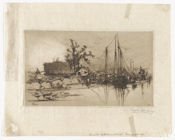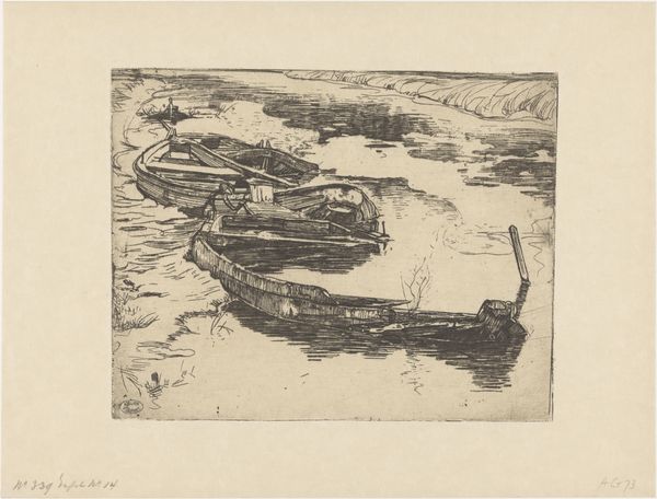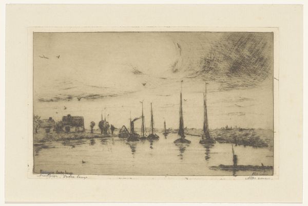 Carel Nicolaas Storm van 's-Gravesande created this etching of the port of Bergen op Zoom. The composition of this print is carefully structured around horizontal bands of land, water and sky. The artist employs line and texture to evoke a sense of spatial depth and atmospheric perspective. Look closely at how the dark, dense marks in the foreground gradually lighten as they recede towards the horizon, creating an illusion of distance. The etching technique, with its fine lines and tonal variations, captures the subtle gradations of light on water and the textured surfaces of the clouds above. The composition destabilizes any fixed point of view to evoke feelings of tranquility and contemplation. Notice the delicate balance between representation and abstraction, the tension between the real and the imagined. It invites us to question our perceptions and appreciate the beauty of impermanence.