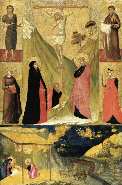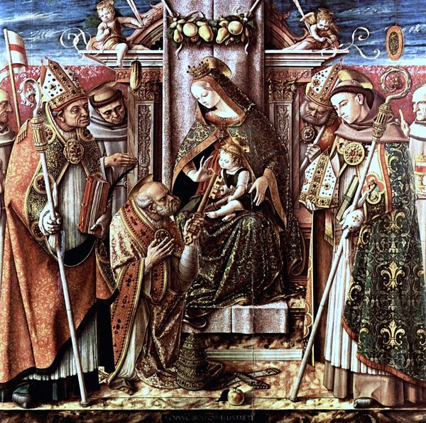 Filippo Lippi made this panel painting of four saints in Florence using tempera on wood. Tempera is a traditional technique that involves binding pigments with egg yolk, meticulously layering colours to achieve luminosity. Looking closely, you can see that Lippi has used this technique to render the rich fabrics and textures of the saints’ robes. The weight of the clothing is conveyed through the careful modulation of light and shadow, demonstrating a skilled understanding of volume and form. The gold detailing would have involved applying gold leaf, a labor-intensive process that adds to the painting's material richness and reflects the economic resources required for its production. This panel not only demonstrates Lippi's mastery of tempera, but also links the artwork to the broader economic and social context of Renaissance Florence, where artistic skill and material wealth were closely intertwined. Understanding these elements allows us to appreciate the painting beyond its aesthetic qualities, recognizing the labor, materials, and economic forces that shaped its creation.