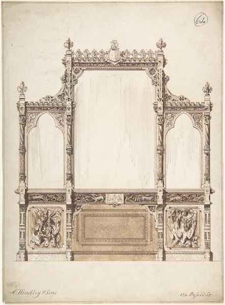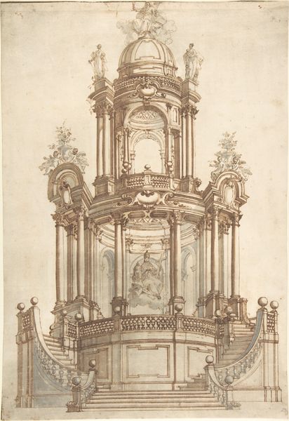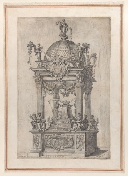 Editor: We're looking at a drawing, a print really, titled "Hexagonal Raised Platform with an Architecturally-Shaped Canopy," created sometime between 1520 and 1550 by an anonymous artist. It’s currently housed in the Metropolitan Museum of Art. The intricacy is captivating – so many details in this sort of sketched architecture. What do you make of it? Curator: What strikes me immediately is the staged quality of the design, indicative of the Italian Renaissance obsession with ideal forms, and geometric precision. Think of the powerful families commissioning art not only to celebrate God, but also to showcase their own sophistication and mastery of humanist ideals. Editor: So you're saying this relates to a kind of power play? Curator: Precisely. Architecture in the Renaissance wasn’t just about shelter; it was about projecting an image. This hexagonal platform with its elaborate canopy suggests a stage for a ritual or a declaration. Who controlled access to that elevated space? Who commissioned it and what kind of authority did this structure represent? Editor: It makes me wonder what purpose it actually served, beyond pure display. Curator: Exactly! It also mirrors the humanist desire to reclaim classical values, evidenced here in the geometric design. Note also how the detailed architectural embellishments showcase wealth and control. Do you see echoes of other works of art produced for elite patrons of the time? Editor: I see more now the subtle echoes of wealth and status in what I initially perceived simply as form and geometry. Thanks! Curator: And I realize even more how easily aesthetic appeal can mask underlying power dynamics. A powerful lesson!