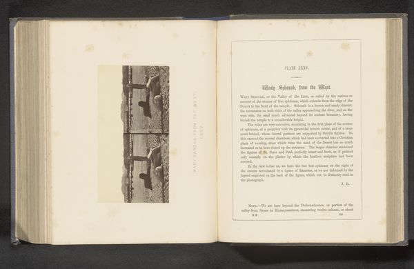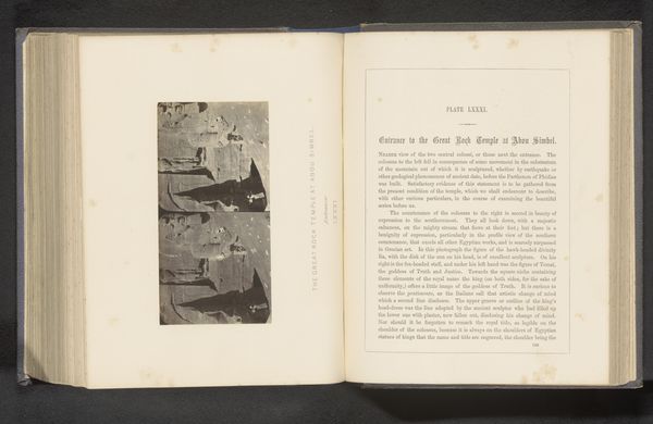 Curator: Oh, look at this intriguing spread. It's a page from an album showcasing a work called "Steengroeve," or "Stone Quarry" in English, by Francis Frith. It seems to have been captured before 1862, a gelatin-silver print now held at the Rijksmuseum. Editor: My immediate reaction is one of stillness and ancient power. The photograph presents these towering sandstone quarries as something almost monumental, sacred, you know? Like the landscape itself is a living record. Curator: Yes, I can see that. Frith’s landscapes often had this way of romanticizing a location through photography. The high contrast between the bright surfaces of the cut stone and the deep shadows in the cavities almost creates a stage, doesn’t it? One imagines ancient laborers, architects… their ghosts imprinted within this stone. Editor: Exactly. And the interesting framing—almost like a diptych—draws attention to the industrial processes, to how these quarries were essentially sites of extraction, fundamental to ancient Egyptian infrastructure, the very foundations of their society. The building of pyramids wasn’t this romantic feat—it relied upon labor, resource depletion... the artist gives it to us devoid of any human presence, emphasizing this sense of the ancient past looming above our contemporary viewpoint. Curator: Indeed. I always find it incredible how the black and white medium in older photography transforms landscapes into these abstract geometric plays of light and dark. It strips away any sentimentality or romantic ideals and just emphasizes this fundamental form—revealing textures and patterns that might have been missed when the world was still in vibrant colour. It also focuses the eye on the artistry inherent in even an industrial site, wouldn’t you agree? Editor: To see this now through the lens of climate crisis adds another layer. We witness, preserved on this aged page, a landscape irrevocably transformed. There is both awe for the ancient engineering, and critique. A critical perspective on how the extraction from the Earth is connected with progress, or with violence, even. Curator: Yes. There's such resonance in seeing that. Frith may not have been making an activist statement, but we can't help but interpret these images through our contemporary lens. Editor: Precisely. It's where the conversation begins, after all, where past intersects with present to enlighten a way forward.