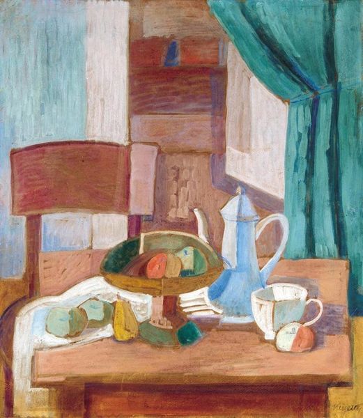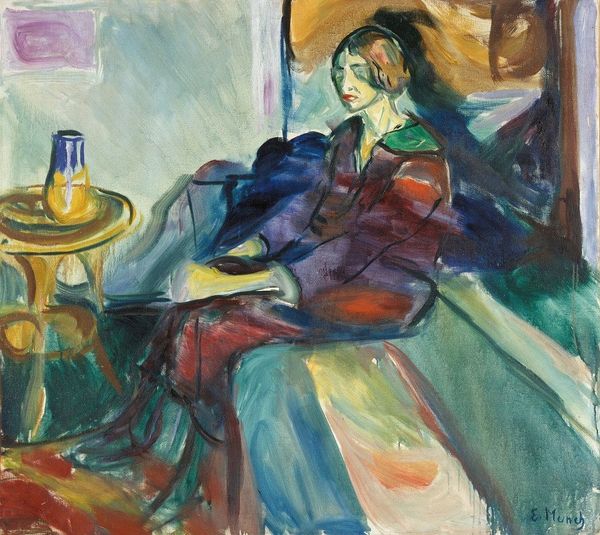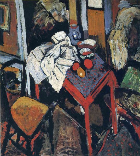 Editor: Here we have Henri Matisse's "The Invalid" from 1899, rendered in oil paint. The brushstrokes are thick, almost sculptural. There's a real sense of stillness, but also, maybe, of isolation. What do you see in this piece, considering the social context of the time? Curator: That's a perceptive observation. Consider the historical moment: the late 19th century, a period marked by shifting social structures, anxieties about health, and evolving roles for women, who were often confined to domestic spaces. What narratives does Matisse seem to engage with through his representation of illness? Is this simply a portrayal of personal suffering, or something more? Editor: Perhaps there's a comment on the constraints placed on women, their lives often limited by health concerns and societal expectations. The darkness surrounding her contrasts with the light on the table. Could that juxtaposition be deliberate? Curator: Precisely! The table, laden yet undefined, might represent a space of possibility, yet it's confined within the larger picture of the woman's physical confinement. Matisse is using color and composition to comment on the domestic sphere as both a site of nurturing and of constraint. It’s also important to consider whose voices were missing in these historical narratives; the lived realities of women outside of the upper classes would’ve been vastly different. How does this painting make you consider absent voices? Editor: It definitely prompts me to think about whose experiences aren't represented, and how class and social standing would impact health and access to care. Curator: And understanding those absences helps us build a more complete, and critical, view of art history. Editor: This really reframes how I see not only this painting, but portraiture of this period. I’m appreciating the subtleties of impasto technique so much more.
