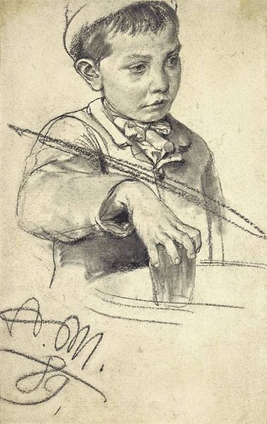 Curator: Edouard Manet's “A young man peeling a pear,” painted around 1868, offers a slice-of-life genre scene rendered with a distinctly modern approach. What catches your eye first? Editor: The melancholy! It feels like the quiet before a storm, or the lingering aftermath of a forgotten sadness. The pear becomes a prop in his private theater. Curator: It’s a departure from traditional portraiture. The composition leads the eye less to the sitter’s face than his hands and the meticulously rendered pear itself. Consider how Manet’s impasto technique renders the luminosity of the fruit's skin. Editor: Right. The pear isn’t just a pear—it’s practically a character. I get a sense that the peel dropping to the table mirrors this young man, Leenhoff, shedding some outer layer, some youthful skin. A transformation of sorts? Curator: Possibly. Leon Leenhoff was the son of Suzanne Leenhoff, who later married Manet, and this painting resides intriguingly within a domestic context. Observe the restricted palette; earthy browns contrasted with the cool blues and greens of the table and fruit, enhancing this reflective mood you identified. Editor: The darkness that threatens to swallow the young man and his task suggests the passing of time or an elegy— the pear decays with each cut. Even his unfocused gaze has a transient quality, a symbol for an unfixed identity and impermanence. The rough brushstrokes only seem to further isolate this fellow. It’s brilliant! Curator: The seeming spontaneity is crucial; however, remember that it is a very carefully constructed effect. What is depicted is not raw experience but, rather, mediated, selected, refined, and translated onto the canvas with deliberation and craft. Editor: I’d agree. Looking at this seemingly simple scene now, knowing more, I appreciate the psychological density and wonder. Even a small act can speak volumes about where a person is in their own history. Curator: Indeed, it transforms an everyday action into a significant moment—pregnant with potential meaning for artist and viewer alike.