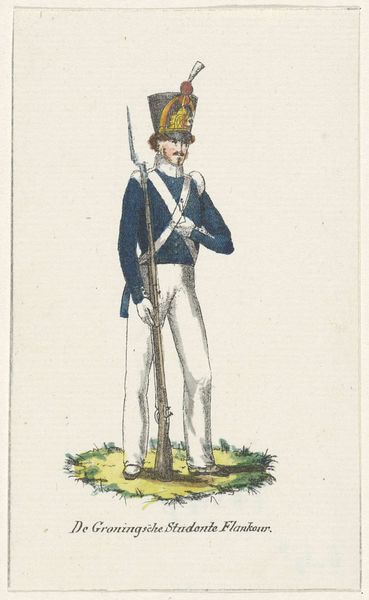 Editor: This is Johannes Senn's "Kongelig livjæger," created in 1807, using watercolor and drawing. I'm struck by how meticulously the uniform is rendered; you can almost feel the weight of the rifle and the precision of each button. What can you tell us about the context of this artwork? Curator: Well, considering the socio-political climate of 1807, this image serves less as a simple portrait and more as an assertion of power and order. Senn captures the regalness and authority of the royal guard, contributing to the Danish monarchy's strategy of projecting strength. Think about how imagery of soldiers, especially those directly linked to royalty, plays in constructing national identity. What details within the illustration emphasize this power dynamic? Editor: I suppose the upright posture, the direct gaze, and maybe even the puff on the hat add to that image. Is the choice of medium significant here? Curator: Absolutely. Watercolor and drawing, while capable of great detail, were also accessible and relatively reproducible. This suggests a potential dissemination of the image beyond elite circles, reaching a wider audience and shaping popular perceptions of the monarchy and its military might. This Romanticized view certainly hides some difficult facts of Danish rule and society. Does this shift your perspective at all? Editor: It does! I initially saw it as just a well-done illustration, but knowing it's tied to projecting power and shaping national identity changes everything. It’s a fascinating insight into how art can function as a tool of social and political influence. Curator: Exactly. Examining art through its historical and institutional context unveils layers of meaning and intention that might otherwise be overlooked.