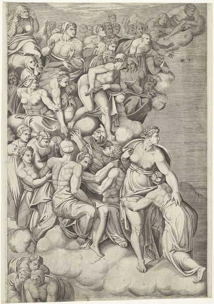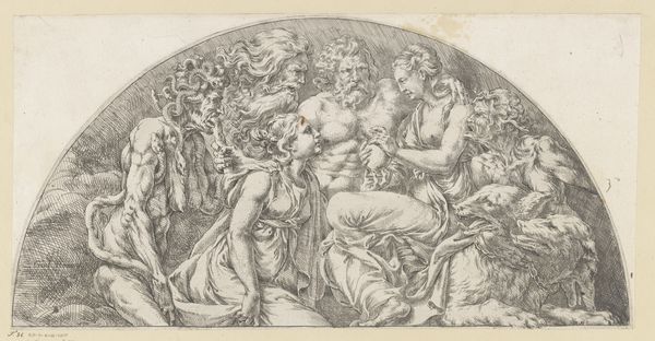 Editor: So, here we have Luigi Ademollo’s drawing, “Moses and the Brazen Serpent,” rendered in ink on paper. The drama! The figures contort and writhe – it’s quite a scene of chaos and desperation. What exactly is happening here? Curator: Well, at face value, it illustrates a biblical story, a common subject for art through the ages, of course. But consider how such a dramatic depiction might function in a specific social context. How does visualizing this particular moment in religious history reinforce certain power structures? Editor: Power structures? Could you expand on that? Curator: Certainly. Think about it: Ademollo presents Moses as this powerful intercessor, holding aloft the cure for the plague. The people are utterly dependent, writhing in pain, eyes fixed on him. The imagery promotes the idea of hierarchical leadership, right? God, Moses, the people. Who would commission such an image, and what purpose might it serve beyond simple illustration? Editor: Maybe someone seeking to reinforce their own authority or promote the church's? This could almost be propaganda. Curator: Precisely. It’s crucial to remember that artistic choices are rarely neutral. The depiction of suffering, salvation, and leadership within a religious framework serves particular ideological ends. Note also the visual language – the echoes of classical sculpture, imbuing the scene with a sense of timeless authority. Editor: That makes total sense. It’s not just about the story; it’s about how the story is being told, and *why*. Curator: Exactly! And how that ‘why’ is intrinsically tied to the artwork’s position in society. This really opens my eyes to the social and cultural contexts of art. Editor: Mine too! I'll definitely consider the public role of art, especially when it portrays a moment in history, going forward.