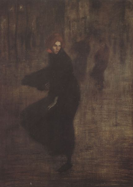 Editor: "In the Promenade," painted by Giovanni Boldini around 1905... it’s oil paint, clearly, with quite thick application – impasto, I think they call it? There's a definite flurry of motion, but the colors are so muted; what draws your eye when you look at this piece? Curator: Isn't it something? It almost vibrates with unseen energy. Boldini was the master of capturing the Belle Époque, wasn’t he? All those fancy Parisian women with their tiny waists and impossibly large hats! This painting...it's not just a portrait; it’s a feeling, a breath of fresh air on a breezy day. See how he uses those sweeping brushstrokes to suggest movement? Almost as if she's a fleeting memory. He is really suggesting that these women were like fireflies. Ephemeral. You know? Like they’d only last for a certain time. Now do you see it? Editor: I do. A fleeting moment captured in paint... So it's not so much *about* the woman as the moment in time? Curator: Precisely. Think of him, desperately trying to keep time from slipping away in his hands... I see that sentiment in how rushed and fleeting the brushstrokes are. The palette further adds to that feeling, like old photos. Brown, muted, old-fashioned… Editor: So, this isn't just a portrait; it’s a time capsule, full of emotions and maybe a touch of bittersweetness. Curator: Absolutely! And you know what? I think that is what draws me back to Boldini. That sense of melancholy, veiled beneath all the frills and finery. Thanks for seeing with me, truly!