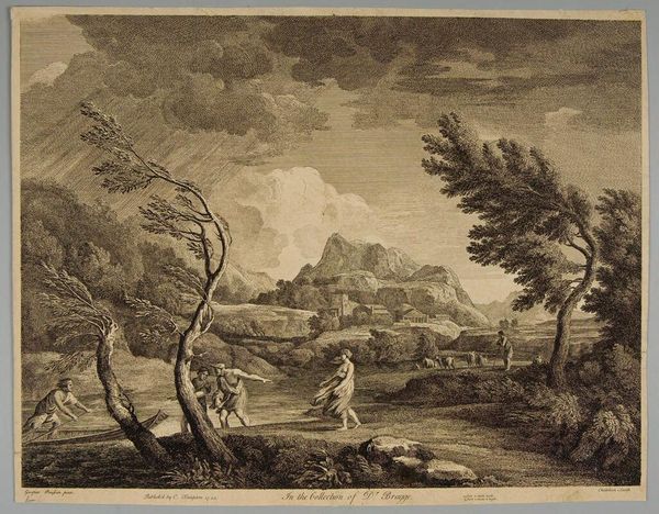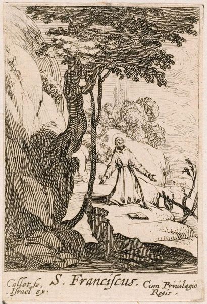 Editor: This is Melchior Küsel's "Holy Family's Flight into Egypt," an etching. The landscape dominates, overshadowing the figures. What do you make of that? Curator: It reflects a shift in artistic focus, where landscape wasn't just background but carried its own symbolic weight. How does it reflect the political climate? Editor: Well, religious narratives were often used to comment on contemporary issues. Is this landscape then a reflection of some kind of political turmoil? Curator: Possibly. The idyllic setting juxtaposed with flight could be a commentary on disrupted peace, or maybe a longing for stability. It’s about the public role of religious imagery, you see. Editor: I see, the art reflects the broader societal anxieties, making it more than just a bible story illustration. Curator: Exactly, and considering how prints circulated, this image reached a wide audience, shaping public perception of religious and political events. Editor: Thanks, this makes me think of it differently!