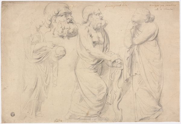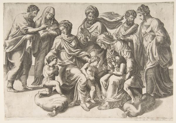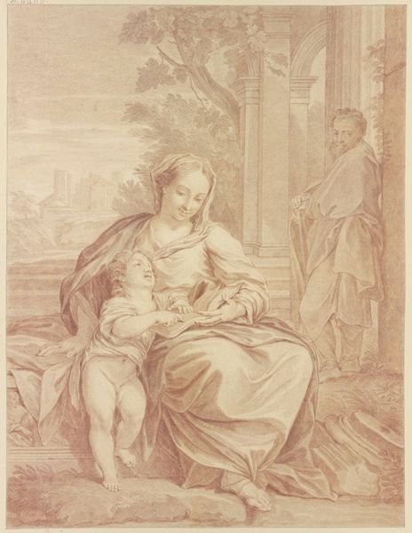 Francesco Bartolozzi created "Two Young Women and an Old Man," using a combination of etching and engraving techniques in 1786. The print, made during a period of significant social and political upheaval, reflects the prevailing fascination with classical ideals, Neoclassicism, and the era's patriarchal structures. In the print, two youthful women flank an older, bearded man. Their expressions are demure, almost subservient. The imagery underscores a dynamic in which youth and beauty are placed in service of age and wisdom. During the late 18th century, the roles of women were often limited to those of muses or allegorical figures, perpetuating their dependence on male authority. Bartolozzi here seems to reinforce traditional gender roles. Yet, there's also a sense of longing in the eyes of the women, perhaps hinting at a desire for agency beyond the confines of societal expectations. It is in these subtle emotional cues that the artwork transcends mere representation and becomes a poignant commentary on the constraints and aspirations of its time.