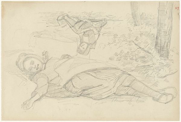 Charles Rochussen created this pencil drawing, titled 'Two Women Visiting a Sleeping Boy', in the Netherlands at an unknown date. The sketch depicts a vulnerable male figure slumbering, observed by two women whose gestures are somewhat ambiguous. Rochussen was a well-known genre painter, celebrated for his depictions of everyday life in the Netherlands. The imagery reflects the cultural norms of the time, particularly concerning gender roles and the male gaze. In the 19th century, representations of women often served moralizing purposes, while the sleeping male subject may allude to themes of innocence and vulnerability. To fully understand this drawing, one might research Dutch genre painting and the artistic conventions of the period. This requires examining social and institutional contexts that shaped its creation and reception. Only then can we grasp its significance as a historical document reflecting the values of its time.