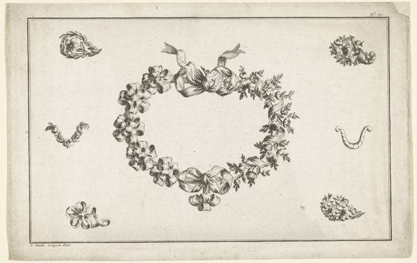 Editor: Here we have "Festoen met een granaatappel in het midden," or Festoon with a Pomegranate in the Middle, a print by Francoys Dancx, made before 1677. The crisp lines forming this garland give it a really formal feel. What’s your take on this from a historical perspective? Curator: This print offers us a fascinating window into the social function of art during the Baroque period. The precision of the engraving elevates what might seem a simple decoration into a status symbol. Editor: Status symbol? How so? Curator: Think about the cost of commissioning such a piece. It demonstrates wealth and taste, aligning the owner with ideals of beauty and refinement that were being actively promoted by powerful institutions. How would a print like this have been used? Editor: Perhaps to decorate a home, showing off wealth, as you said? Curator: Exactly. It speaks to the increasing importance of visual culture and how art served as a marker of social standing. It would also serve as source for other artists when creating large scale decorations. It's more than just a pretty picture; it's evidence of a carefully constructed cultural landscape. Editor: I hadn’t considered the social aspect so directly. It’s like a visual representation of power. Curator: Precisely. The very act of displaying such an image becomes a form of cultural capital. Hopefully that helped broaden how you view prints, as so much more than images on paper. Editor: Absolutely. Now I see the print itself as an artefact deeply embedded in its time. Thank you.