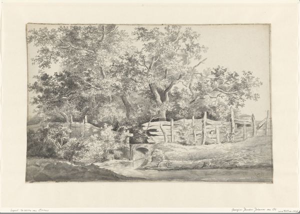 Curator: This is Jean Jacques de Boissieu's "Mill with Two Draughtsmen on the Right," a detailed etching from the 18th century, presently held at the Harvard Art Museums. Editor: I am struck by the dichotomy of the tranquil scene and the turbulent water; it is a calm chaos in a way. Curator: Indeed! The mill, often a symbol of industry and progress, stands in contrast to the raw, untamed power of the water. Consider how the two draughtsmen frame that tension, perhaps intending to capture the essence of this industrial-natural interaction. Editor: And the draughtsmen themselves! Their presence is intriguing. They are not merely documenting; their act of observing transforms the landscape into a subject of intellectual and aesthetic pursuit. Curator: Their placement implies a kind of ownership or even control over the landscape, fitting within the Enlightenment's fascination with reason applied to the natural world. Editor: It's like a captured moment, but it transcends a simple snapshot, representing the relationship between humanity and nature during that era.