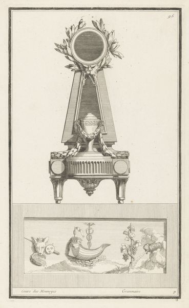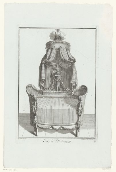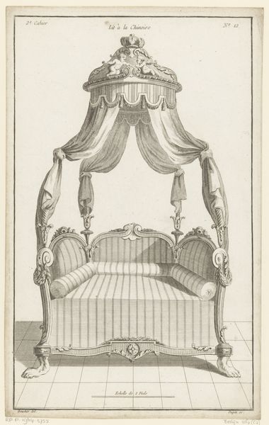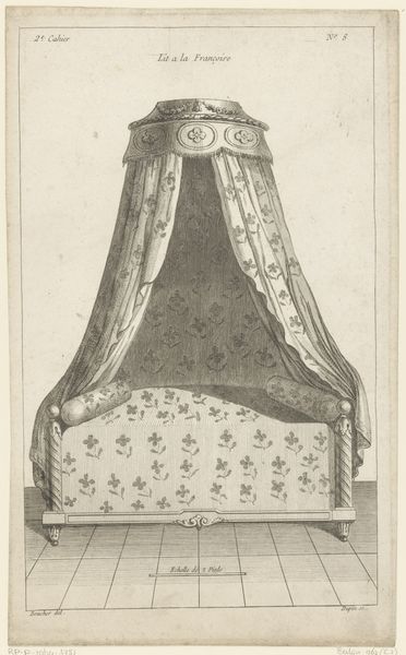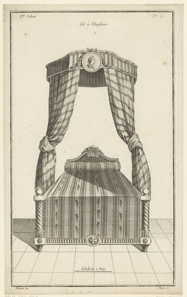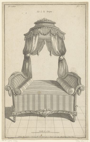 Nicolas Dupin's "Hemelbed met medaillon en putti" presents a meticulously rendered vision of opulence through the graphic precision of etching. The symmetrical composition immediately draws the eye, with the canopy bed's elaborate drapery and decorative elements creating a sense of formal grandeur. The interplay of linear patterns, from the striped fabric to the ornamental flourishes, underscores a commitment to aesthetic order. Dupin's work can be interpreted through the lens of structuralism, where the binary opposition of solid and void, curve and line, generates meaning. The bed, as a cultural signifier, transcends its functional purpose, becoming an emblem of status. The print invites us to consider how the semiotic system of 18th-century design communicated ideas about luxury and taste. The visual language constructs not just an image of a bed, but also a commentary on the values of its time, prompting us to reflect on the enduring power of design to shape perception.