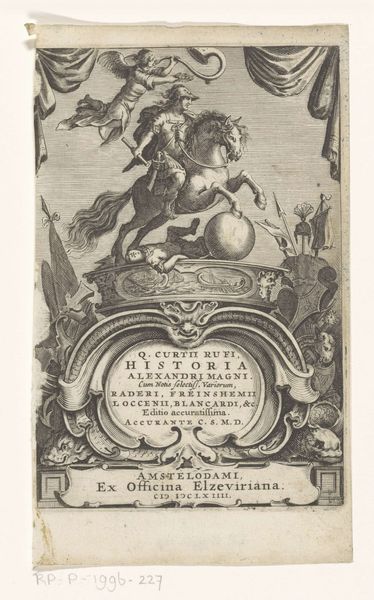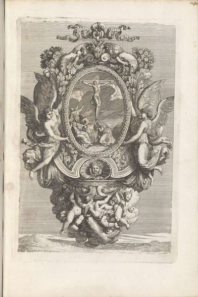 Curator: Look at the stunning detail in this 1657 engraving by Matthäus Merian the Younger, currently housed in the Rijksmuseum. It's the title page for Johannes Jonstonus's "Historiae Naturalis de Avibus Libri VI"—a book about birds. Editor: My first impression is how Baroque it is; so opulent and densely packed! The artist really used the entire surface to build out that swirling drama. Curator: The technique is exquisite. The intricacy of the pen work truly elevates this to something more than just a functional piece; there is a real artistry in the execution. It speaks to a vibrant printmaking industry at the time, doesn't it? One geared towards scientific dissemination. Editor: Absolutely. Formally, I am struck by how Merian balances the weight of the allegorical figure at the top with the ornate cartouche in the center, framing the book’s title and author. Note also how all of the elements are visually linked; see how the gazes of the various creatures lead your eye through the image? Curator: And how are we meant to view that labor? The engraving, after all, makes knowledge about birds available to a wider, literate public. What did this expanded knowledge then offer back to early modern society and culture? This wasn't just art for art’s sake, there was an intrinsic commercial aspect. Editor: True, but observe also the ship on the sea. Note its positioning at the base. It grounds the fantasy and highlights trade and exploration. Visually, it anchors the upper allegorical register to a lived human experience, that is, a human enterprise with its own forms and needs. Curator: It makes you wonder what kind of workshop Merian maintained. There were probably apprentices involved in some of the labor; the labor for the engraving certainly reflects this hierarchy. Editor: You are right, the print is not simply about ornithology, it encapsulates a specific period’s mode of viewing the natural world, one infused with religion and symbolism—the stars crowning the central figure, the cherubs. These touches point to meaning that transcends pure visual depiction. Curator: I'll never think of these Baroque title pages the same way again; that detailed, intricate execution speaks volumes. Editor: Indeed, examining how visual elements shape and are shaped by historical contexts certainly enriches our viewing experience.