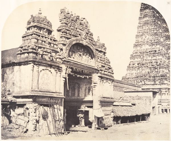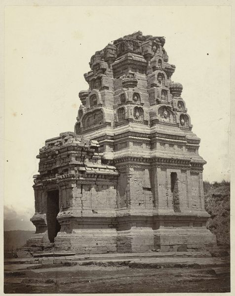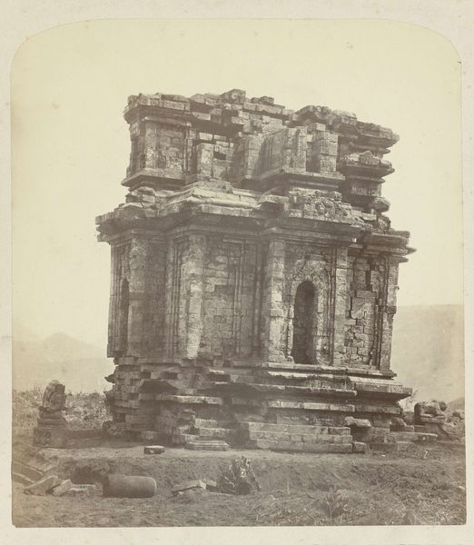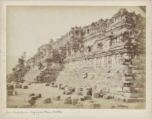 Editor: So, this albumen print by Isidore Kinsbergen, possibly from the 1860s, depicts the side wall of the Candi Sari Monastery near Yogyakarta. The monumentality is incredible, yet it’s also overtaken by nature. What strikes you most about this photograph? Curator: I see a powerful tension between the enduring nature of religious architecture and the inevitable forces of change represented by the encroaching vegetation. Consider this photograph in the context of Dutch colonial power. How do you think Kinsbergen's choice of subject matter and photographic style might be seen in relation to colonial interests? Editor: That’s interesting, I hadn’t thought about it that way. Perhaps he was trying to show the decay of a culture that the colonists were "superior" to? Or perhaps this was also part of some early "Orientalist" craze among the public? Curator: Exactly! These photographs circulated in Europe, shaping perceptions of Southeast Asian culture and history. The romantic decay adds to a narrative easily consumed by a Western audience, solidifying a sense of cultural dominance. What about the figures on the walls, who do you think would have seen it at the time, in both Yogyakarta and Europe? Editor: In Yogyakarta, those seeing this photo in album form might've known, and therefore cared about the deities displayed along the monastery wall. Perhaps viewers in Europe would not grasp the spiritual or ritual significance of these figures. But with wide distribution across social classes, did photography in colonial contexts lead to more accurate or less accurate public understanding? Curator: A question that haunts art historians today. This single photograph is more than a picture, isn't it? It's an artifact embedded in a complex web of social, political, and artistic contexts, shaped by the power dynamics of its time. Editor: It is absolutely fascinating how a seemingly simple image holds so much historical and cultural weight. It's definitely made me think more deeply about photography and its role in shaping our understanding of history. Curator: Indeed. It is a reminder that art is never created in a vacuum, and that considering its historical context is crucial for a comprehensive interpretation.
