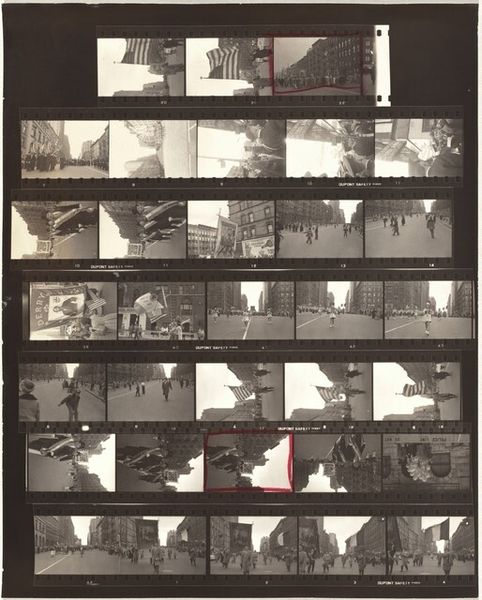 Curator: Let's turn our attention to Robert Frank's "Guggenheim 409--Los Angeles," a gelatin-silver print made between 1955 and 1956. It presents itself as a contact sheet, revealing Frank's working process and photographic choices. Editor: It strikes me as a fragmented narrative, a series of glimpses. There is a cinematic quality. Each frame feels loaded with untold stories, yet held together by an unmistakable atmosphere of 1950s America. Curator: The contact sheet format is key here. It foregrounds the labor involved—the act of selecting and discarding images in the darkroom. Frank wasn't just capturing a moment but crafting a commentary on visual representation. Consider how the rows of images echo the repetitive nature of urban life and also his method. Editor: Absolutely. And within that structure, individual images resonate with iconic American themes: lunch counters, city streets bustling with cars, even what appears to be the Guggenheim Museum itself. These elements seem to reflect mid-century optimism tinged with a sense of detachment, something the grainy, high-contrast black and white reinforces. Curator: The graininess indeed underscores the realness of the images and also a deliberate departure from pristine commercial photography of the time. This raw quality speaks to Frank's critical perspective on American society and challenges the consumerism of that era. What meanings do you extract from this raw perspective? Editor: I see a layering of meaning. Frank captures physical spaces and social moments. These visual icons simultaneously convey a sense of place and something far less tangible: alienation, uncertainty, the subtle unease beneath the surface of post-war American prosperity. He suggests this through symbolic composition rather than directly representational figures. Curator: Precisely, he offers a potent mix of social critique through its direct representation in gelatin silver—cheap to reproduce, widely accessible. And the method of using a contact sheet to emphasize how photographs are made is, to me, a vital commentary in our increasingly image-saturated world. Editor: Looking at this contact sheet has been thought-provoking. Frank masterfully weaves cultural and personal narratives into an exploration of modern urban experience, reminding us of the loaded significance images have and continue to carry.