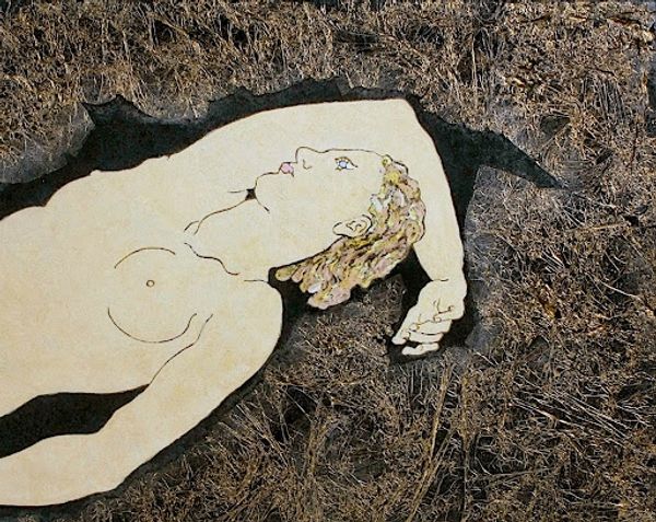 Kit Williams created this painting, *Distress Call,* employing surreal imagery and symbols that beckon the viewer to deeper reflection. Notice the juxtaposition of the nude figure with a bird obscuring her face. Birds often symbolize freedom, but here, it seems to eclipse the woman's identity. The nest of fledglings with mouths agape draws our eye. Across cultures and eras, the nest is a symbol of home, safety, and nurturing. The human female body is placed in contrast with the animal nest, bringing forward subconscious associations and memories. Consider other artworks featuring birds and nests; the symbolism of birds as messengers or omens recur throughout art history. The painting triggers complex emotions: vulnerability and natural connection. The car in the background is a modern note that makes us consider the relationship between nature and the modern world. "Distress Call" captures a non-linear progression of these symbols, and how they have resurfaced, evolved, and taken on new meanings in our modern context.