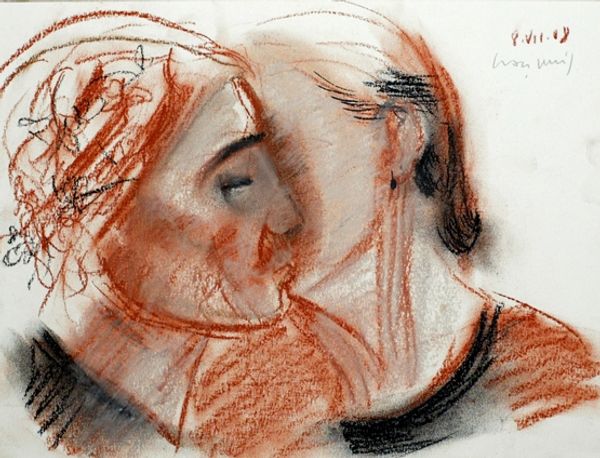 Editor: This is "Vrouwenhoofd, naar links kijkend" by Isaac Israels, created sometime between 1887 and 1934. It's currently housed at the Rijksmuseum. I’m immediately drawn to its raw, almost vulnerable quality. What strikes you most about this piece? Curator: The quick, almost frantic strokes speak volumes, don’t they? The red watercolor washes alongside the harsher pencil lines suggest an attempt to capture something fleeting, something emotional, beyond just a physical likeness. Think about the symbol of the color red. What does that evoke? Editor: Passion, maybe? Or even a sense of unease with those almost haphazard strokes around the face. It seems like he's trying to capture an internal state. Curator: Precisely! The incomplete nature enhances this. What isn't shown is as important as what is. This sketch might reveal the woman’s inner turmoil or reflect the artist’s own emotional state. Could those dark charcoal strokes hint at societal constraints, anxieties, or even hidden desires, common themes represented in female portraits? Editor: That makes me think about the historical context. The late 19th century saw shifts in representations of women. This isn't the idealized woman of earlier art. It’s a much more realistic portrayal. Curator: Yes! It's pulling away from archetypes. The direct gaze – or rather, averted gaze – adds to the sense of individuality. This simple study is incredibly rich in possible symbolic interpretations. Does viewing the image from that context change your view? Editor: Definitely. I initially saw just a quick sketch, but now I see layers of emotion and cultural significance embedded within those lines and washes. Curator: And it is precisely that symbolic density layered throughout time and captured in such visual language which informs how we understand the past and the people in it. What do you make of that going forward? Editor: That makes me consider how images carry so much cultural weight and personal memory. This wasn't just a portrait; it's a glimpse into another era, a conversation frozen in time. Thanks for untangling so many elements in one quick sketch!