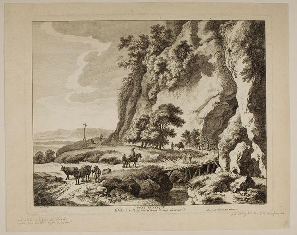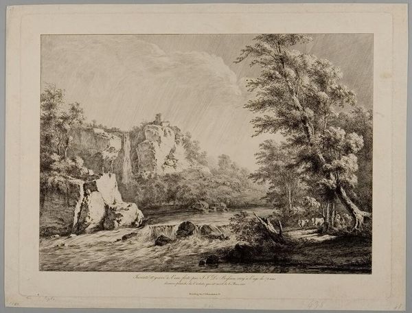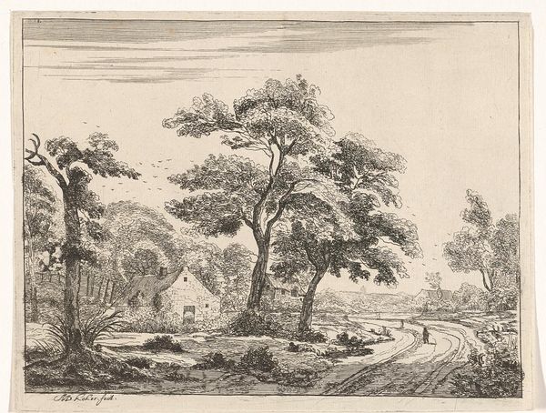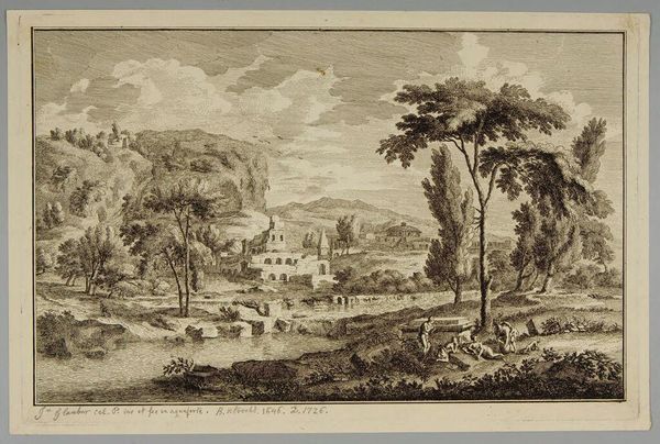 Editor: So, we have before us "Hermitage" by Andreas Achenbach. It seems to be a print of some kind. I’m immediately struck by this sense of tranquility, but also something a bit melancholic. What do you see in this piece? Curator: Ah, yes, a quiet corner. The artist invites us to reflect on nature and spirituality, doesn't he? The landscape is so precise! It's a Romantic yearning, a visual poem. Notice how the light catches the chapel roof, almost a beacon amidst the trees. Does that beckon you? Editor: I suppose I didn’t immediately notice the light and shadow, but that’s a great point! Thanks for pointing that out. Curator: My pleasure, there's always something new to see!