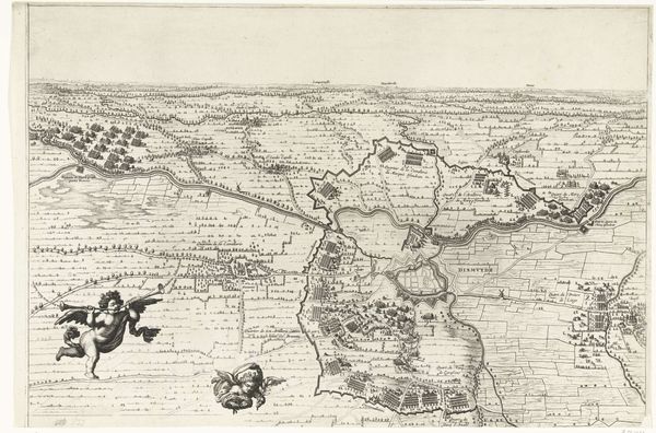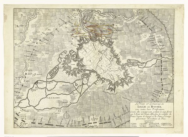 This is an anonymous print from 1622, depicting Spinola's siege of Bergen op Zoom. The formal composition strikes us first: a structured, almost geometric rendering of space and military strategy. The stark lines delineate fortifications, troop deployments, and the town's layout, creating a detailed map-like view. The artist employs a bird's-eye perspective to flatten the landscape, compressing depth and emphasizing the intricate network of lines that define the siege's dynamics. This use of line not only maps physical space but also charts the power relationships and strategic calculations of warfare. The lack of color further accentuates the stark geometry, reducing the scene to essential forms and structures. In this way the print serves as both record and interpretation, reflecting a broader early modern interest in the semiotics of space and power, where every line and angle signifies intent and control. This artwork invites us to consider how visual representation shapes our understanding of historical events.