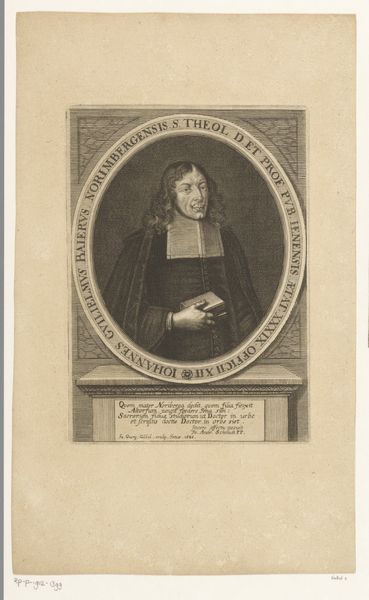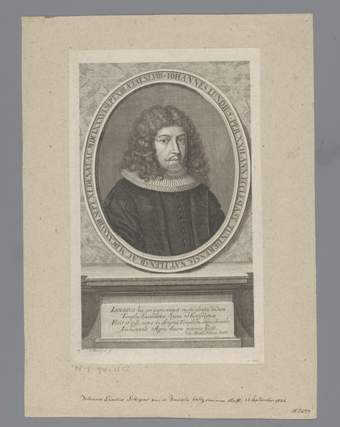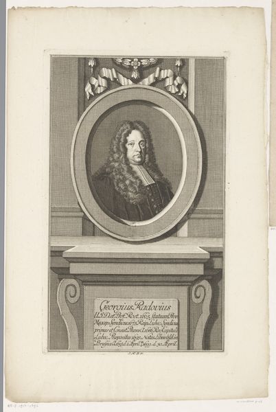 Curator: Here we have Johann Georg Göbel’s 1690 engraving, "Portret van Andreas Reyher," currently held at the Rijksmuseum. It depicts a rather stern-looking gentleman framed within an oval border. Editor: Stern, yes! He reminds me of someone who wouldn't suffer fools, a no-nonsense intellectual peering out at us from the past. Almost…unapproachable. Curator: Well, let's delve into the printmaking process a bit. Consider the societal value placed on portraiture during the Baroque period, and how the technique of engraving lent itself to mass dissemination of images, fostering a sort of cult of personality around figures like Andreas Reyher. It also served a role in communicating status. Editor: Exactly! This wasn’t just some quick sketch. Think about the craft, the laborious carving of the lines on the metal plate—so many tiny lines, so carefully placed. Each line carrying meaning, constructing an image that must convey not just likeness but also the sitter's…essence. It makes you think of the value attached to image-making and reputation. Curator: It also challenges our modern expectations of image manipulation. What was added or omitted in translation. Editor: Precisely! I am thinking the subject’s expression…did the artist and sitter engage in ways that were collaborative or conflicting. Was it always flattery…and what materials went into such labor. I do enjoy contemplating these prints and imagine that the act of crafting these lines must have been a kind of meditation for the artist. Curator: A crucial consideration, certainly. The economics of labor and dissemination inform the creation of a “brand.” The act of consumption. Editor: I see, an intricate interplay of status, skill, materials…it's quite a thought to let sink in! This portrait becomes a powerful time capsule and makes me appreciate the dedication and context imbued within a piece like this even more.