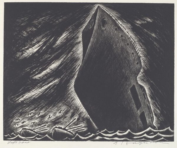 Editor: Here we have "Torpedoed," a print made by Edward Hagedorn in the 1930s, using graphite and etching. It's incredibly striking; the dark monochrome palette and sharp angles create a real sense of chaos and impending doom. How do you interpret this work within its historical context? Curator: This image speaks volumes about the anxieties of the interwar period. "Torpedoed," with its dramatic depiction of maritime disaster, isn’t just a scene; it’s a commentary on vulnerability and the fragility of progress in the face of technological warfare. The 1930s were marked by economic depression, the rise of fascism, and growing fears of another world war, all of which permeated artistic production. Editor: I can see that. The lifeboats seem so small and insignificant against the immensity of the ship and whatever has struck it. Curator: Exactly. Consider how the artist positions the viewer. We're not on the ship, nor are we a distant observer. We're almost in the water, facing the chaos. The dramatic chiaroscuro reinforces a sense of immediacy and vulnerability, pulling the viewer into the narrative. Hagedorn’s use of stark monochrome further amplifies the somber tone. It eliminates any romanticism, emphasizing the harsh realities of destruction. Does it evoke for you other forms of disruption from the time, perhaps on land? Editor: I hadn't thought of it that way, but yes. Thinking of the Depression, the Dust Bowl...it definitely speaks to larger themes of upheaval. What I see now, is that this isn't just about one ship. It's about an entire world on the brink. Curator: Precisely. It pushes us to reflect on the political, economic and military tensions, underscoring art's power to reflect collective fears. Editor: Wow, I'll definitely remember to consider those intersectional narratives. Thanks so much! Curator: My pleasure. Art invites us to see the past as ever-present and pertinent.