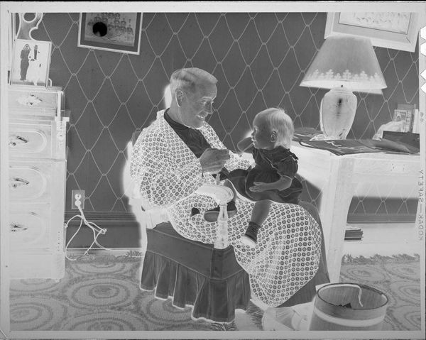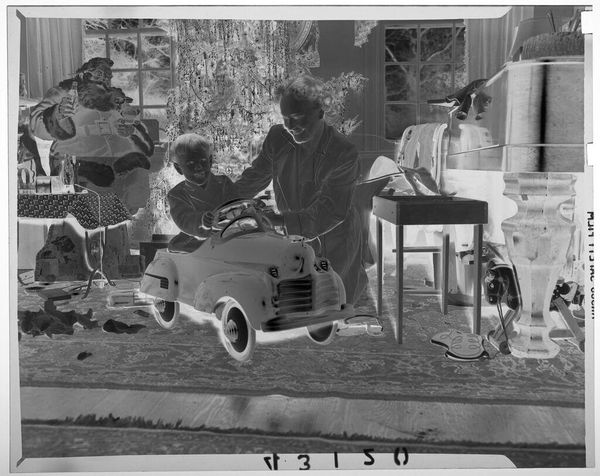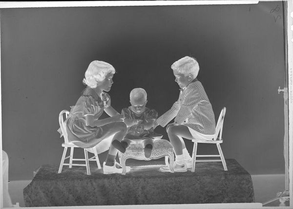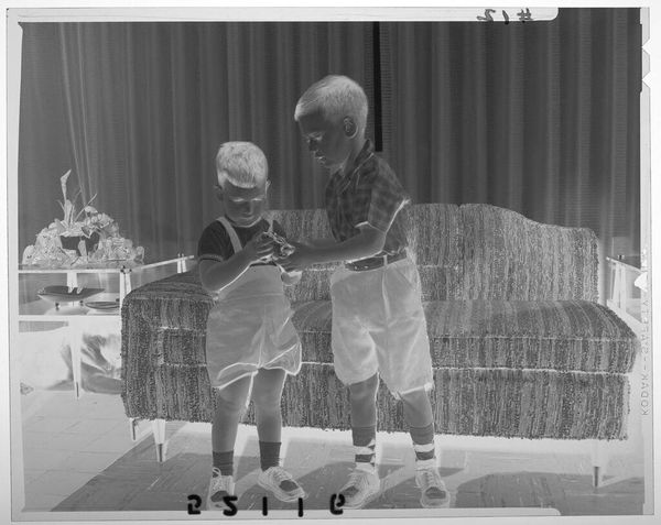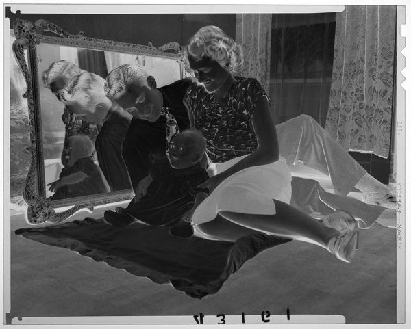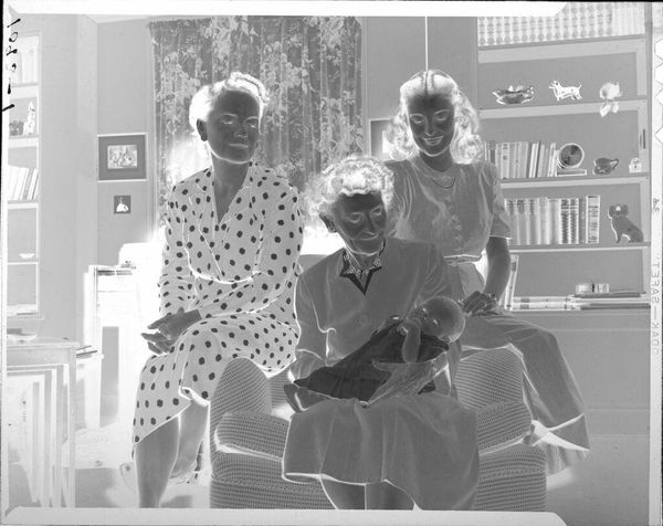 Editor: Here we have an untitled photograph by Martin Schweig, featuring a family on a couch. The image is reversed like a film negative. What stands out to you? Curator: Well, beyond the technical aspects, consider the pose. The parents are smiling, but the child is almost suspended, look at the mother's strained look. What does this tell us about performance of family and gender roles in the mid-century American household? Is this happiness, or just the appearance of it? Editor: That’s a good point. I hadn’t considered the performative aspect. Thanks for making me think critically about it! Curator: Of course! By questioning these representations, we gain a deeper understanding of both the image and the historical context.