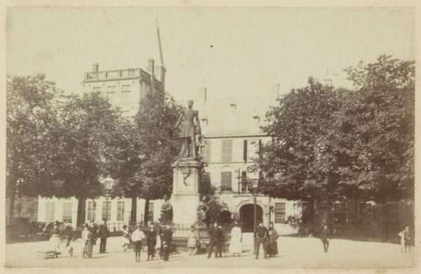 Editor: This is "Monument van koning Willem II op de Heuvel, Tilburg," a photograph dating back to around 1901, captured by David Vermeulen. The sepia tone gives it a really nostalgic, almost dreamlike quality. What do you make of this particular image, in terms of how it captures history and place? Curator: Ah, yes. Vermeulen gives us not just an image, but a whisper from the past. Notice how the monument almost melts into the background. Willem II, caught in amber, nearly becomes one with the trees, doesn’t he? It reminds me of how history itself can sometimes fade, if we're not careful. I find myself asking, is he lost in thought or watching over the city? It’s less a celebration of power and more a melancholic reflection, perhaps, on time's relentless march. Don’t you think? Editor: That's a compelling point. The way the monument blends with the surroundings does soften its presence. I was initially thinking it projected power, but the diffused light changes that completely. Curator: Exactly! It's less about bravado and more about memory, a whisper of a king rather than a shout. The people and horse-drawn carriage in the image also feel ephemeral, like ghosts passing through. What do they evoke for you? Editor: They reinforce the sense of time slipping away. They’re not the main focus, but they give context, grounding the monument in everyday life while still feeling distant. Curator: I agree, beautifully put. We began thinking of this as a static image of power. Editor: And end up with it being so much more nuanced than I first assumed, all thanks to light, place, and a photographer's clever framing of time.