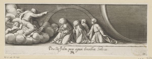 Curator: Alright, let's have a closer look at this print. It's entitled "Plate 3: God Addressing Noah and his Sons, from Genesis Chapter 3, after a lost fresco in the basamento of Bay 13 of the Vatican Loggia," created sometime between 1650 and 1677. The artist is Pietro Santi Bartoli. It's currently held here at the Metropolitan Museum. Editor: Wow, a mouthful of a title! But putting that aside, I find the almost muted quality quite compelling. There's a solemn reverence captured, wouldn’t you agree? A mix of awe and submission in those figures. It feels profoundly heavy with narrative weight. Curator: Indeed. Bartoli was documenting lost frescoes, essentially preserving a visual record. The narrative itself stems from the biblical story of Noah after the flood, specifically God establishing a covenant. The rainbow depicted symbolizes that promise, right above Noah and his sons who kneel on the left, and God and his host on the right. Editor: The use of line is striking! It’s as though light itself is etched into the paper. Makes me consider: Did Bartoli mourn what he recorded as “lost”? It all makes me consider impermanence. Is the artist reminding us about the frailty of human existence? Curator: I think Bartoli was probably conscious of his role. The Vatican Loggia was undergoing transformations; these engravings served a documentary purpose as the original frescoes faced decay or alteration. The creation of prints democratized access. Viewers far removed from the Vatican could now ponder these works, sparking their own reflections. Editor: Thinking of democratizing art reminds me about making space for individual interpretation! It invites conversations, challenges the dominance of singular narratives... Art gets to do some magic. So Bartoli—whether he was trying to or not—helped expand who got to consider these themes, yeah? Curator: Precisely! The politics of visibility and preservation play a critical role here, demonstrating how an artist’s choices about documentation impact public understanding. By giving access to a visual memory, this work makes history a little more alive. Editor: So, next time I am overwhelmed, maybe I should look at old engravings and make my own covenants. I walk away thinking: Loss isn’t always loss; sometimes it’s transformation into something newly accessible.