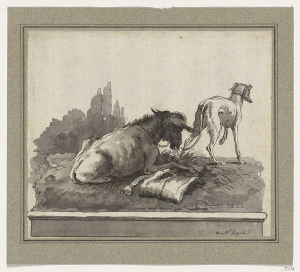 Giovanni Domenico Tiepolo made this pen and wash drawing of a boar and a sow. The image of these animals is more than just a zoological study; it evokes the countryside of 18th-century Italy. During this period, Venice, where Tiepolo worked, was in decline. Artists like Tiepolo often looked to rural life for inspiration, idealizing its simplicity in contrast to the city's complexities. The boar, with its wild energy, can be seen as a symbol of untamed nature, while the sow, sleeping, embodies a more passive, domesticated aspect. Tiepolo here may well be commenting on the changing social values of his time, contrasting the virtues of a simpler, rural past with the perceived decadence of urban life. To fully understand Tiepolo's work, historians consult a variety of resources, from agricultural records to period literature, piecing together the cultural context that gives the artwork its deeper meaning.