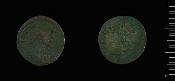 Curator: Here we have what's known as a Fraction of Maximian, Cyzicus, credited to Maximianus I Herculius. It's part of the Harvard Art Museums collection. Editor: It feels like gazing into a tarnished mirror reflecting a ghost of the past. The green patina whispers stories of age and forgotten empires. Curator: Indeed. The corrosion, from a formalist viewpoint, enhances the surface texture, creating an almost pointillist effect across the emperor's profile. Notice how the raised relief catches the light. Editor: Absolutely, though it also obscures details, lending a sense of mystery. I wonder what hands this coin passed through. What bargains were struck, what dreams were chased? Curator: One can only speculate. Yet, the coin remains a potent symbol, a testament to power and enduring materiality despite its diminutive size. Editor: Exactly. It's a humbling reminder that even empires fade. It gives you the feeling that you are holding history. Curator: A fitting synthesis of aesthetic form and historical significance, wouldn't you agree? Editor: I’d say that’s pretty accurate. A great synthesis.