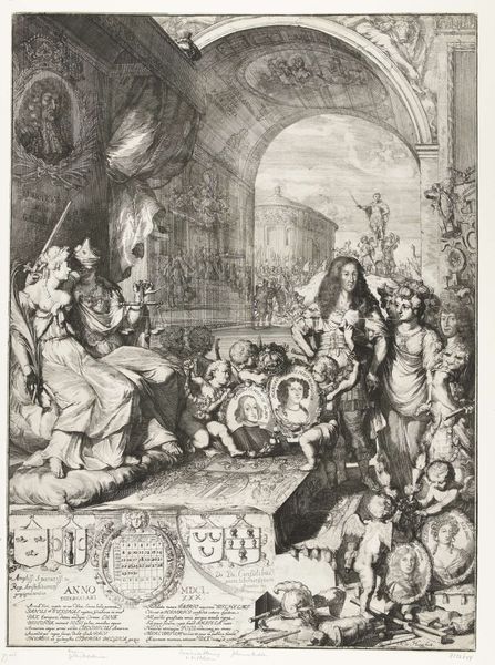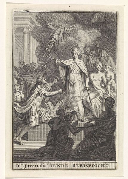 This engraving, "Molière before the Judges of Pluto," was made by Jacobus Harrewijn. Notice how the stark contrast between light and shadow carves out the dramatic scene. It draws us into a realm where the earthly meets the infernal. The composition is structured around a theatrical space. The foreground is occupied by the ghostly silhouette of Molière and his contemporaries, while the court of Pluto looms in the background. Harrewijn uses linear perspective to create depth, leading our eye from the detailed figures in the foreground to the more vaguely defined underworld. The materiality of the engraving—fine lines etched into metal—contributes to the ethereal quality of the image. The scene destabilizes the boundary between life and death. It asks us to consider the enduring power of art and the judgment of posterity.